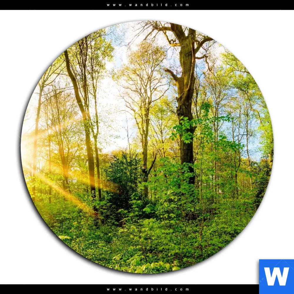 Aluminiumbild gebürstet | Sonnenlicht im Wald | Rund