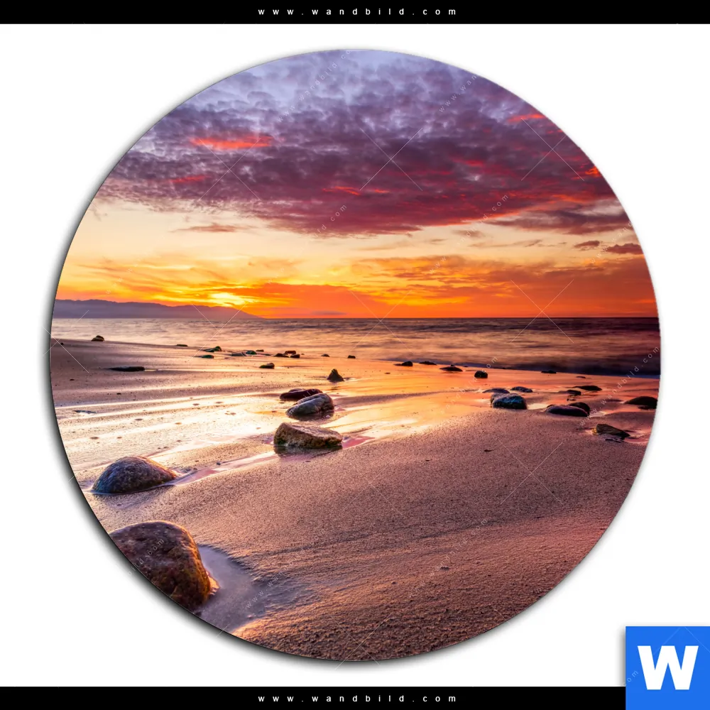 Aluminiumbild gebürstet | Sonnenuntergang am Strand mit Felsen | Rund