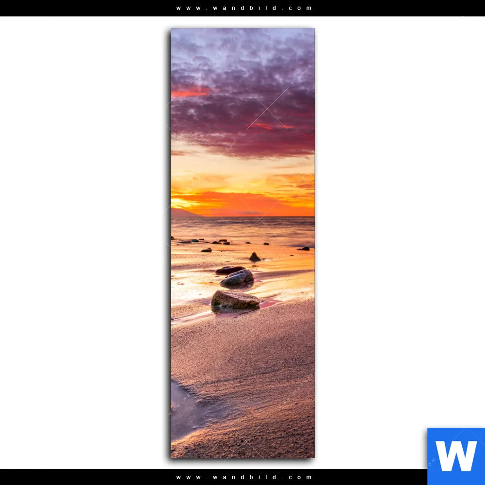 Aluminiumbild gebürstet | Sonnenuntergang am Strand mit Felsen | Schmal