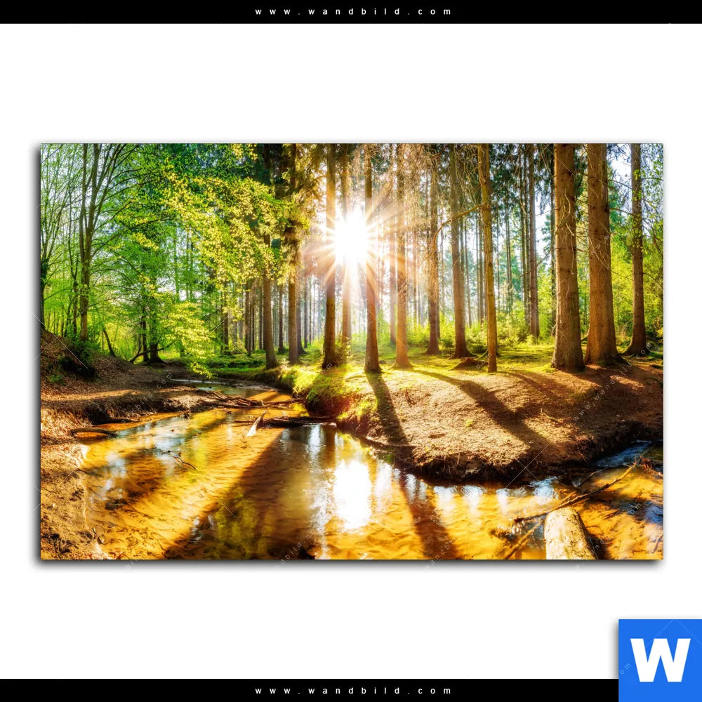 Aluminiumbild gebürstet | Sonniger Wald | Querformat