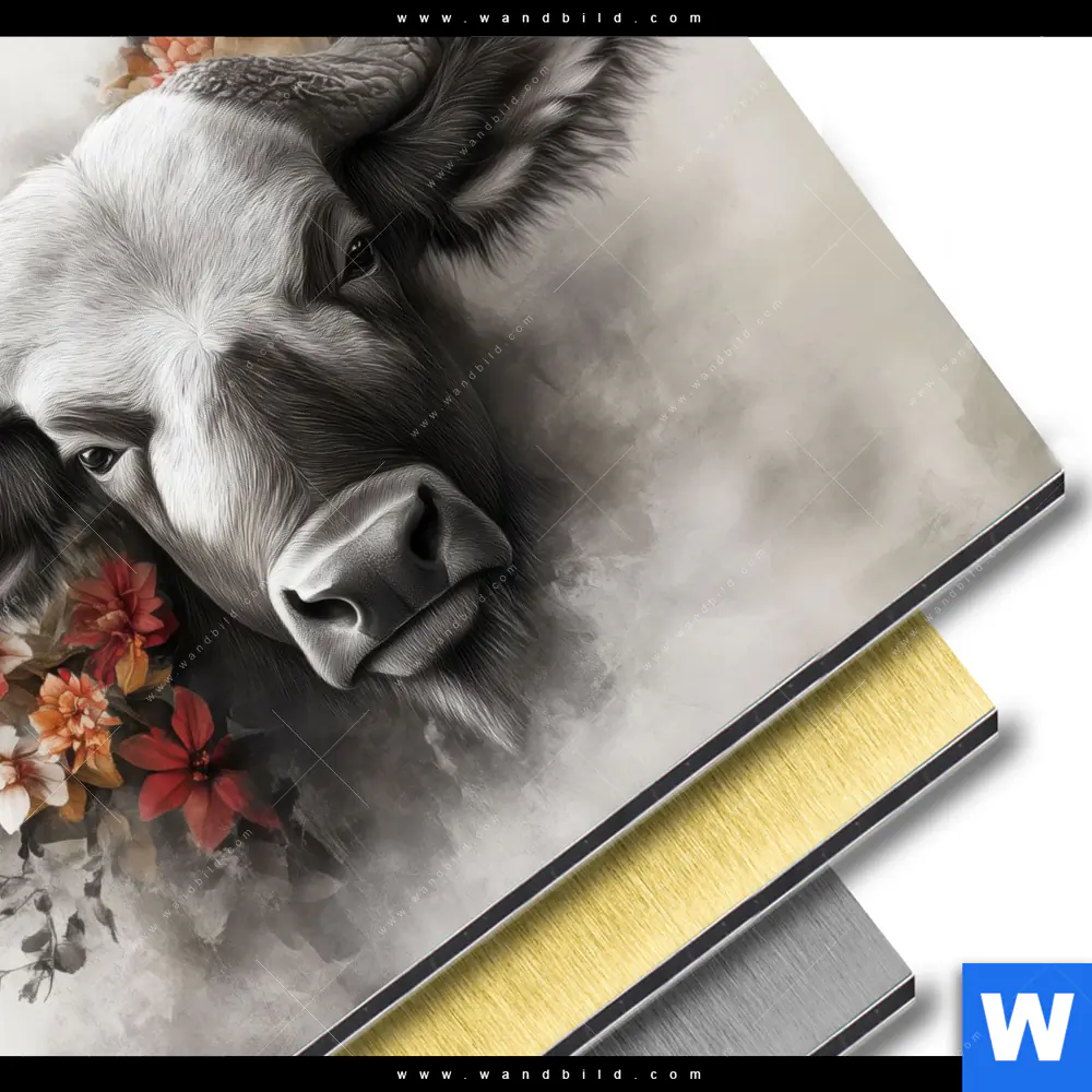 Aluminiumbild gebürstet | Starker Bulle mit Blumen | Quadrat
