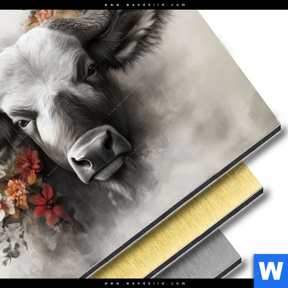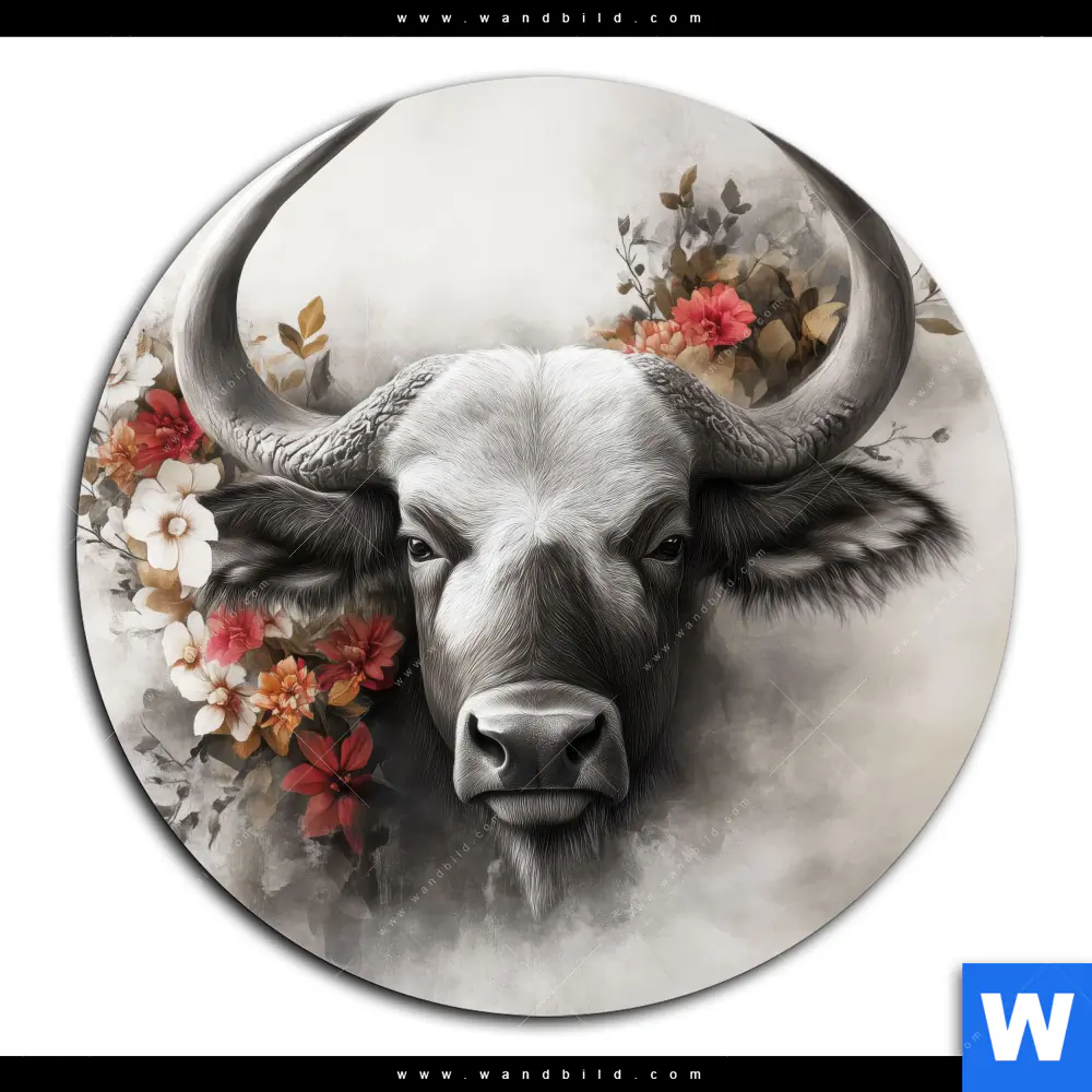 Aluminiumbild gebürstet | Starker Bulle mit Blumen | Rund