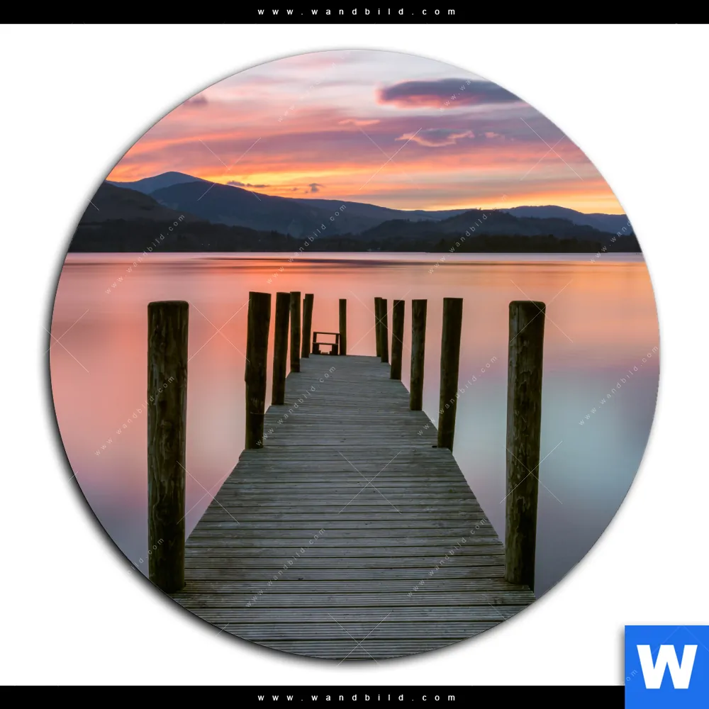 Aluminiumbild gebürstet | Steg in den Sonnenuntergang | Rund