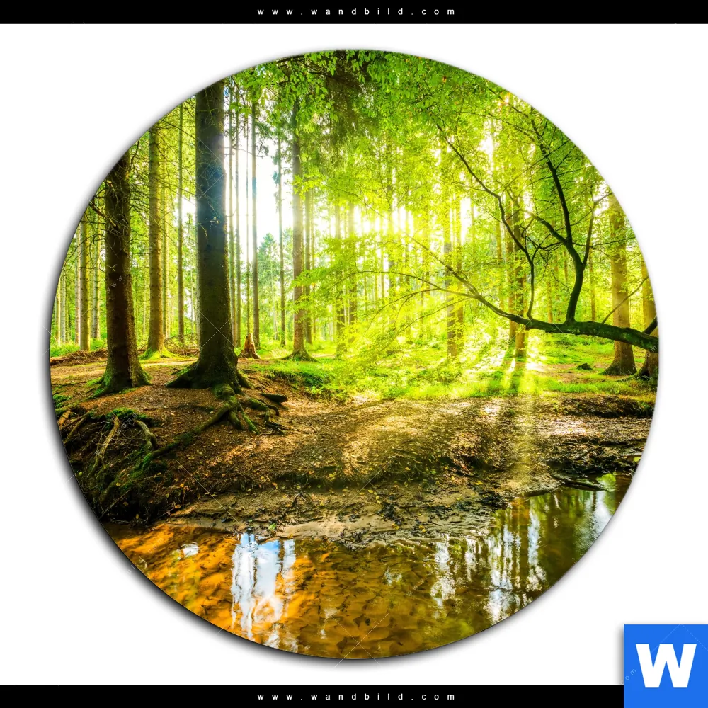 Aluminiumbild gebürstet | Wald mit Sonnenstrahlen | Rund