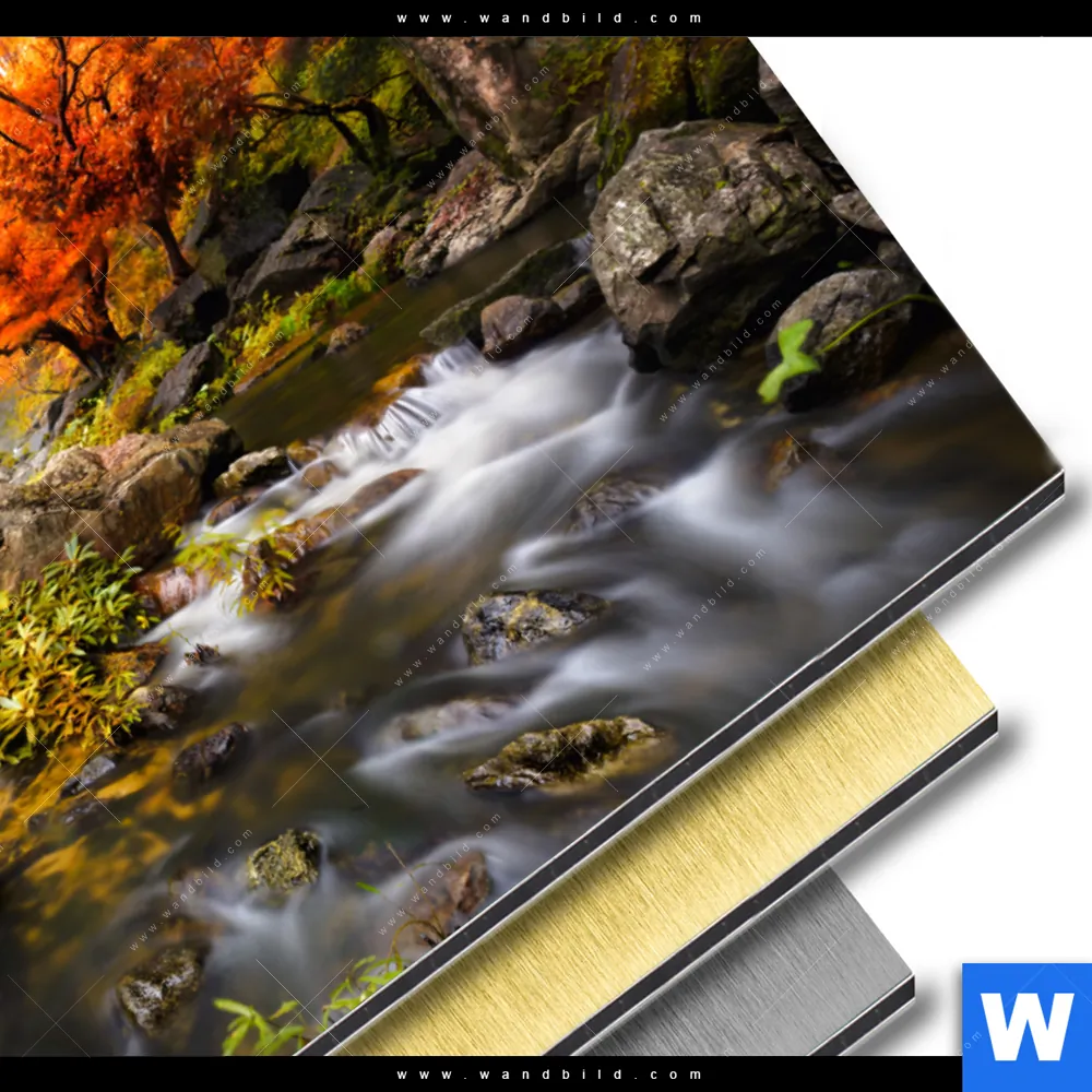 Aluminiumbild gebürstet | Wasserfall in Herbstlandschaft | Querformat