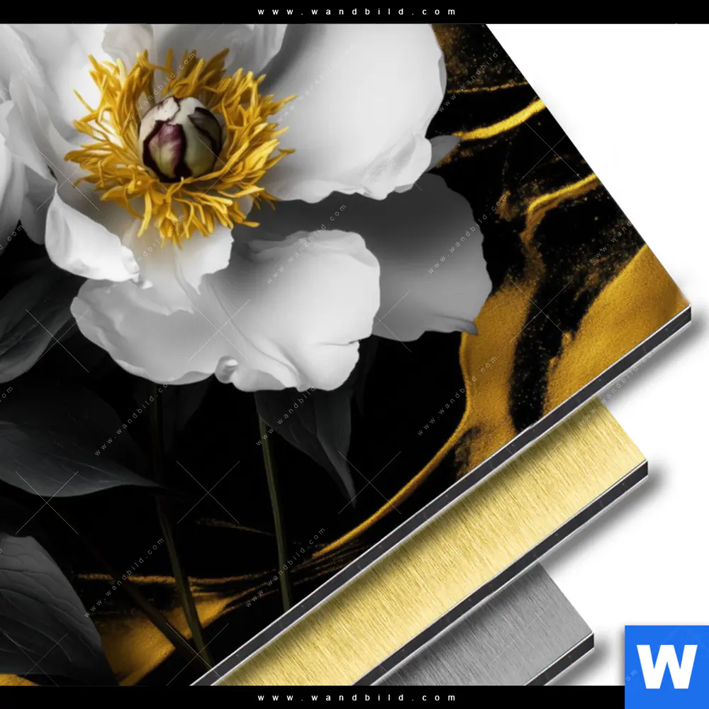 Aluminiumbild gebürstet | Weiße Blumen mit Gold | Hochformat