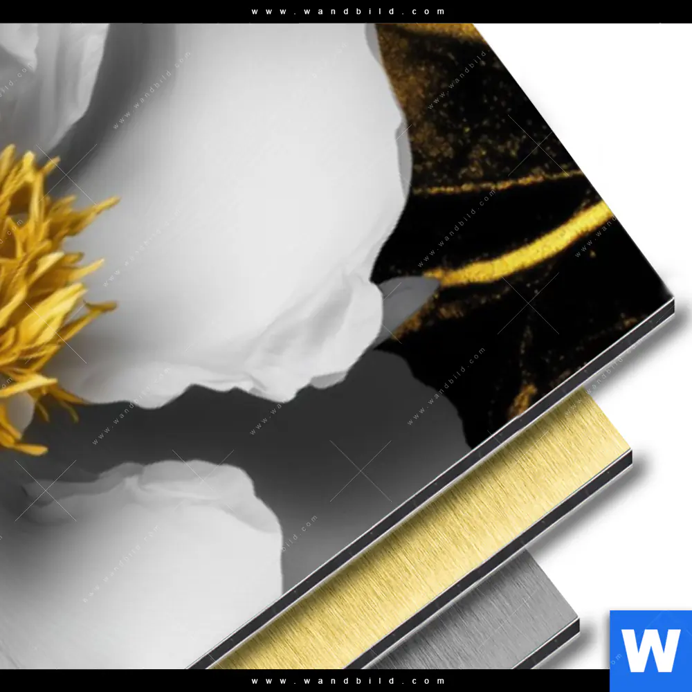 Aluminiumbild gebürstet | Weiße Blumen mit Gold | Schmal