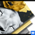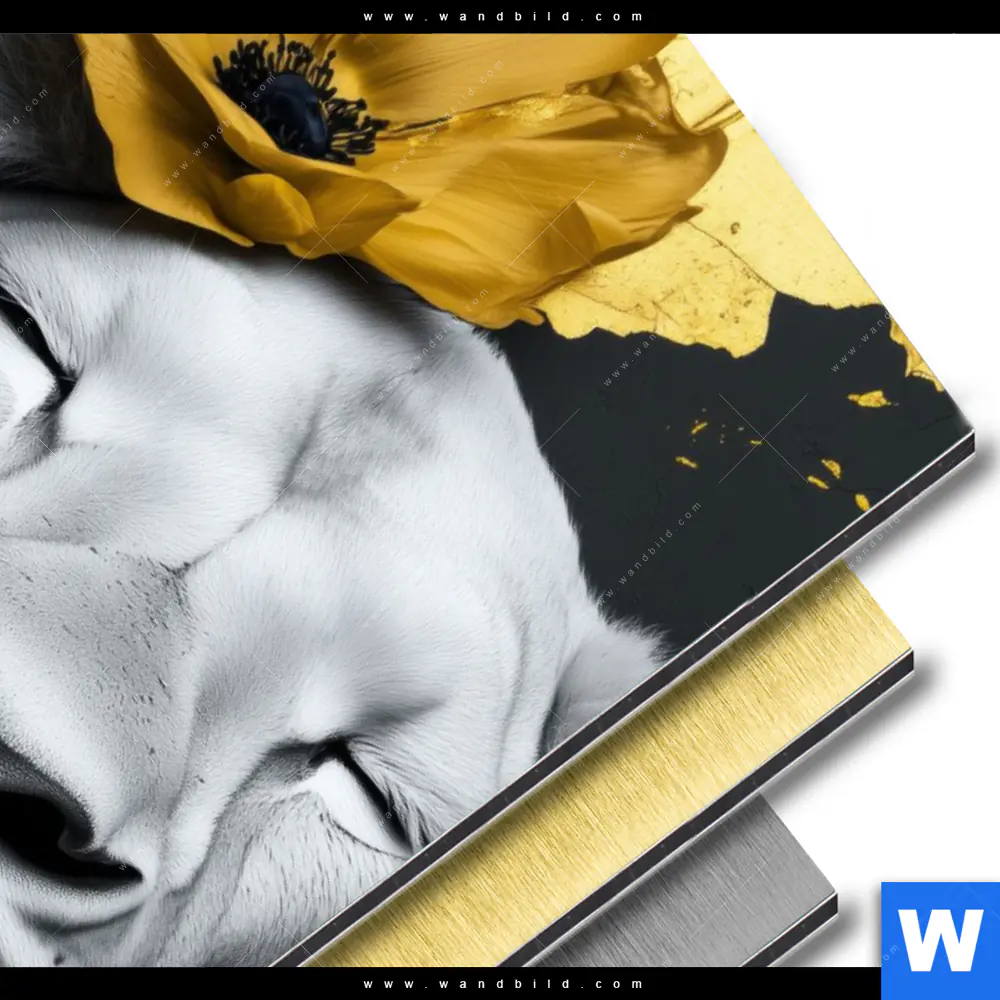 Aluminiumbild gebürstet | Weiße Löwin mit Goldblüten | Hochformat