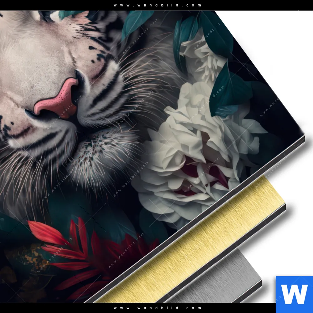 Aluminiumbild gebürstet | Weißer Tiger mit blauen Augen zwischen Blumen | Quadrat