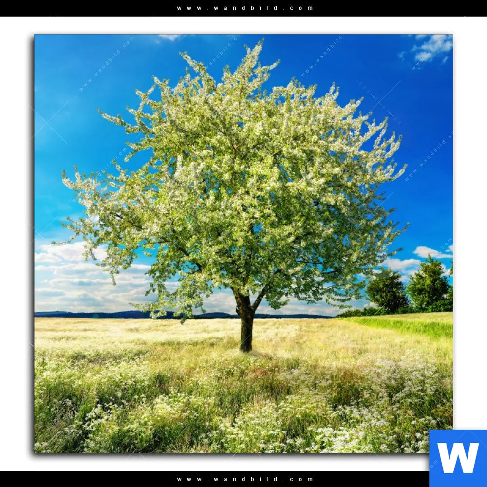 Aluminiumbild gebürstet | Wiese mit blühendem Baum | Quadrat