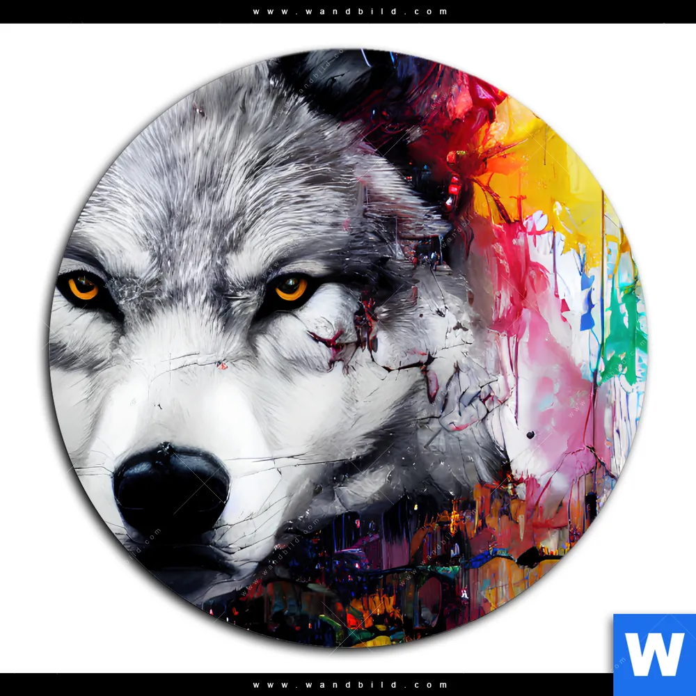 Aluminiumbild gebürstet | Wolf mit bunten Farbspritzern | Rund
