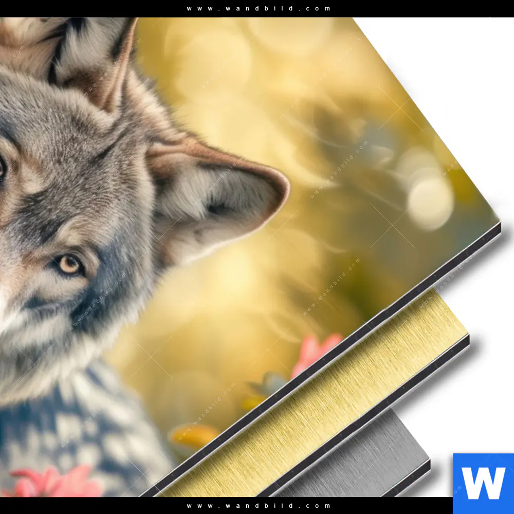 Aluminiumbild gebürstet | Wolfsblick im Frühling | Hochformat