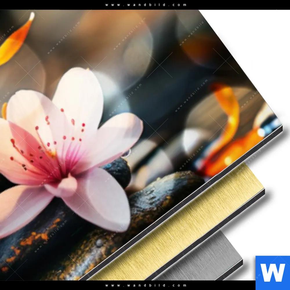 Blumen - Botanik, Buddha - Feng Shui Aluminiumbild mit metallischem Effekt inkl. vormontiertem Rückrahmen