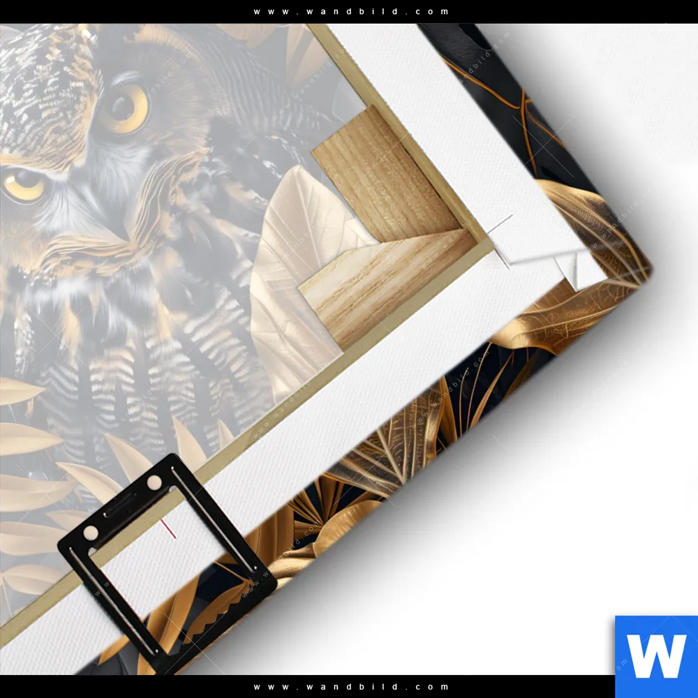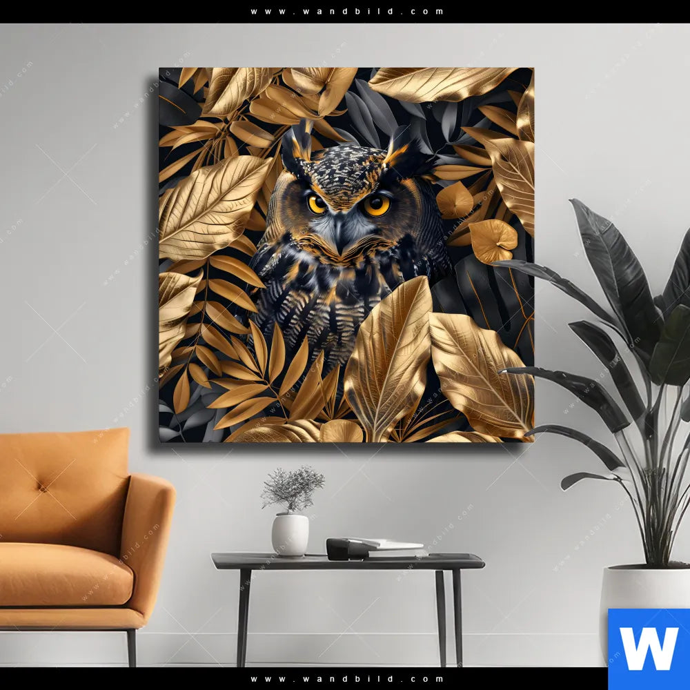 Leinwandbild | Eule und goldene Blätter | Quadrat