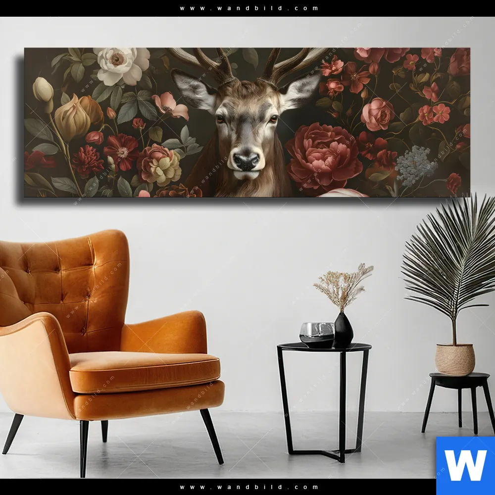 Leinwandbild | Friedlicher Hirsch und Blüten | Panorama