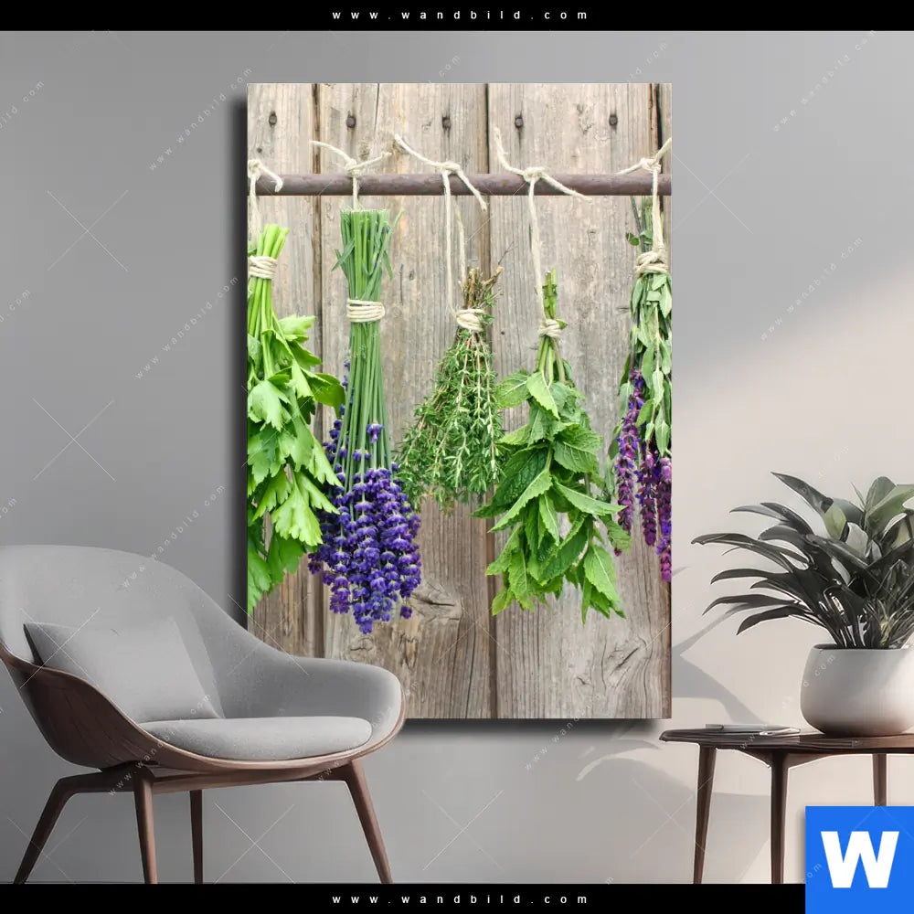 Leinwandbild | Frische Kräuter an Holzstange | Hochformat