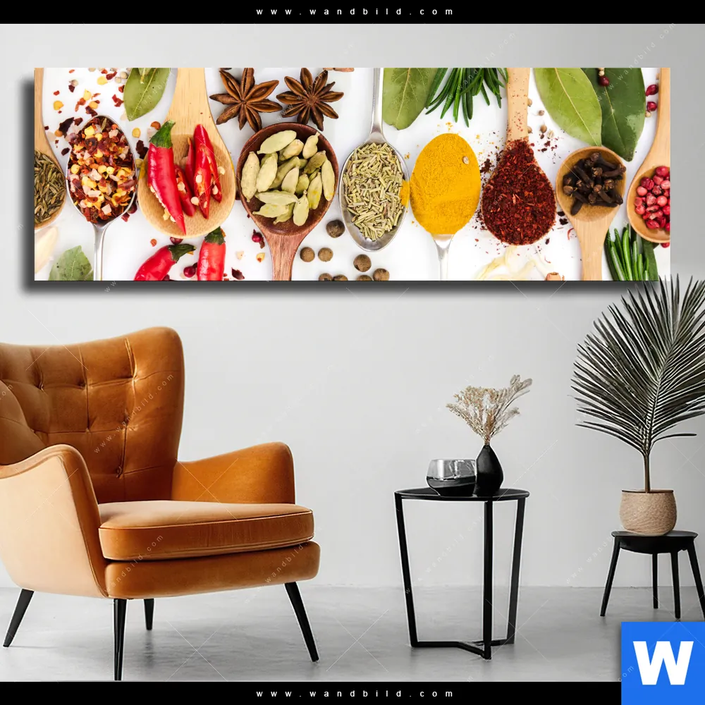Leinwandbild | Gewürze auf Löffeln - weiß | Panorama