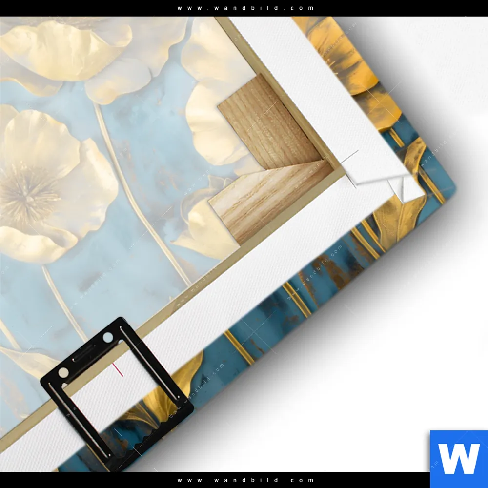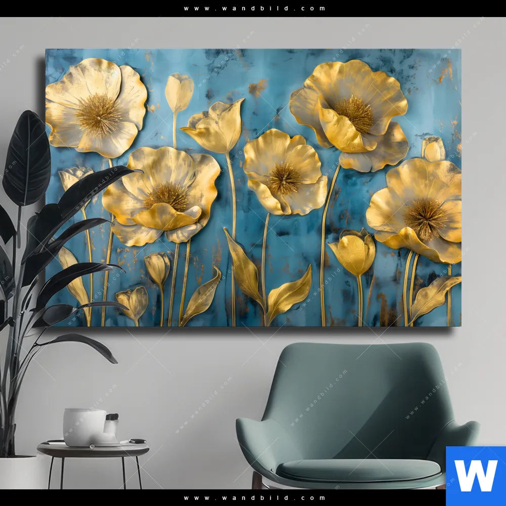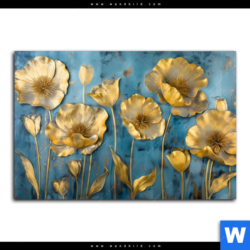 Leinwandbild | Goldene Blumen auf Blau | Querformat