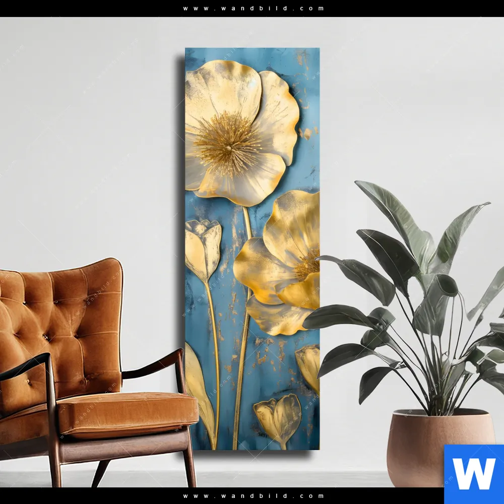 Leinwandbild | Goldene Blumen auf Blau | Schmal