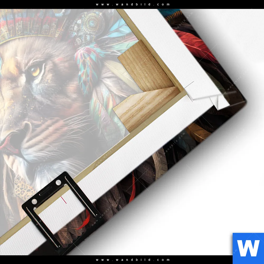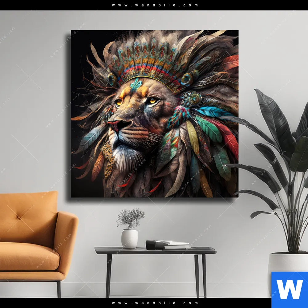 Leinwandbild | Löwenkopf mit bunten Federn | Quadrat