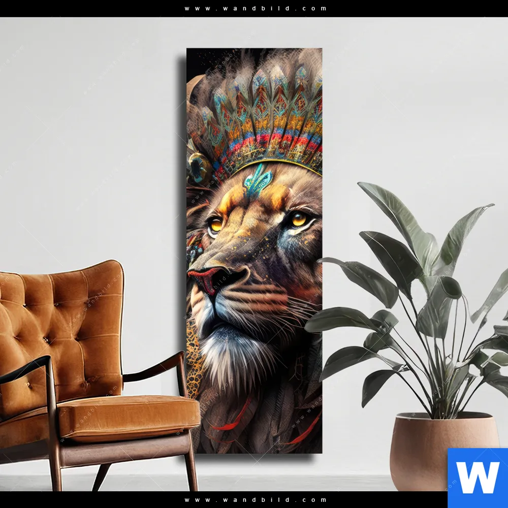 Leinwandbild | Löwenkopf mit bunten Federn | Schmal