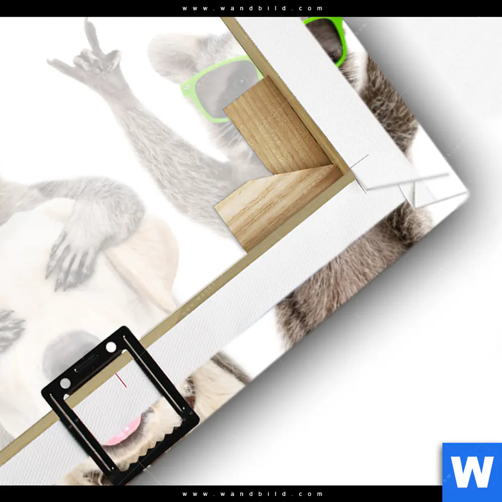 Leinwandbild | Lustige Waschbären mit Hund | Querformat