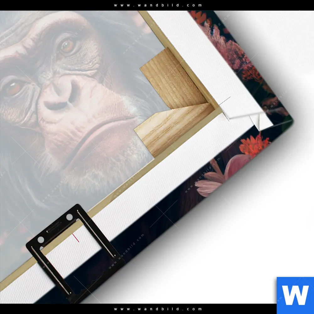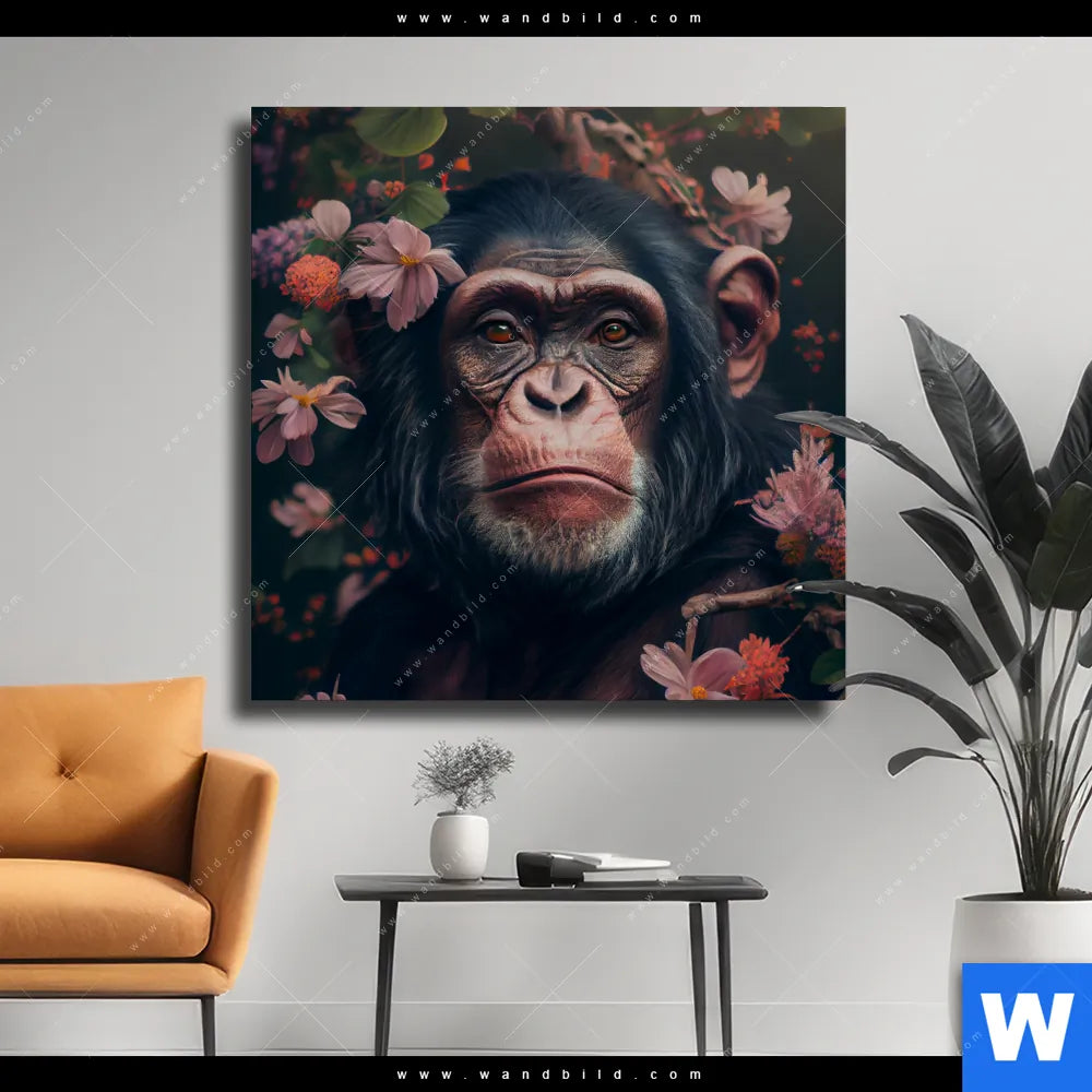Leinwandbild | Schimpanse zwischen Blumen | Quadrat
