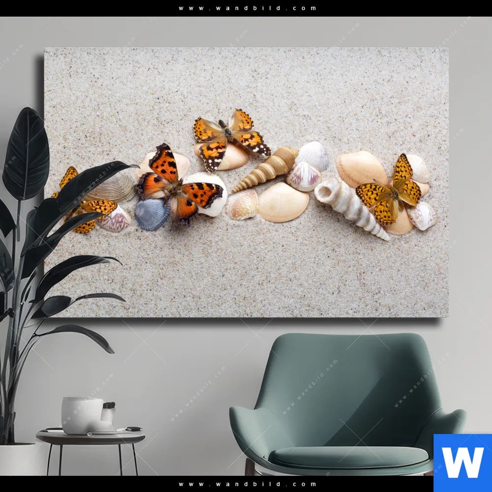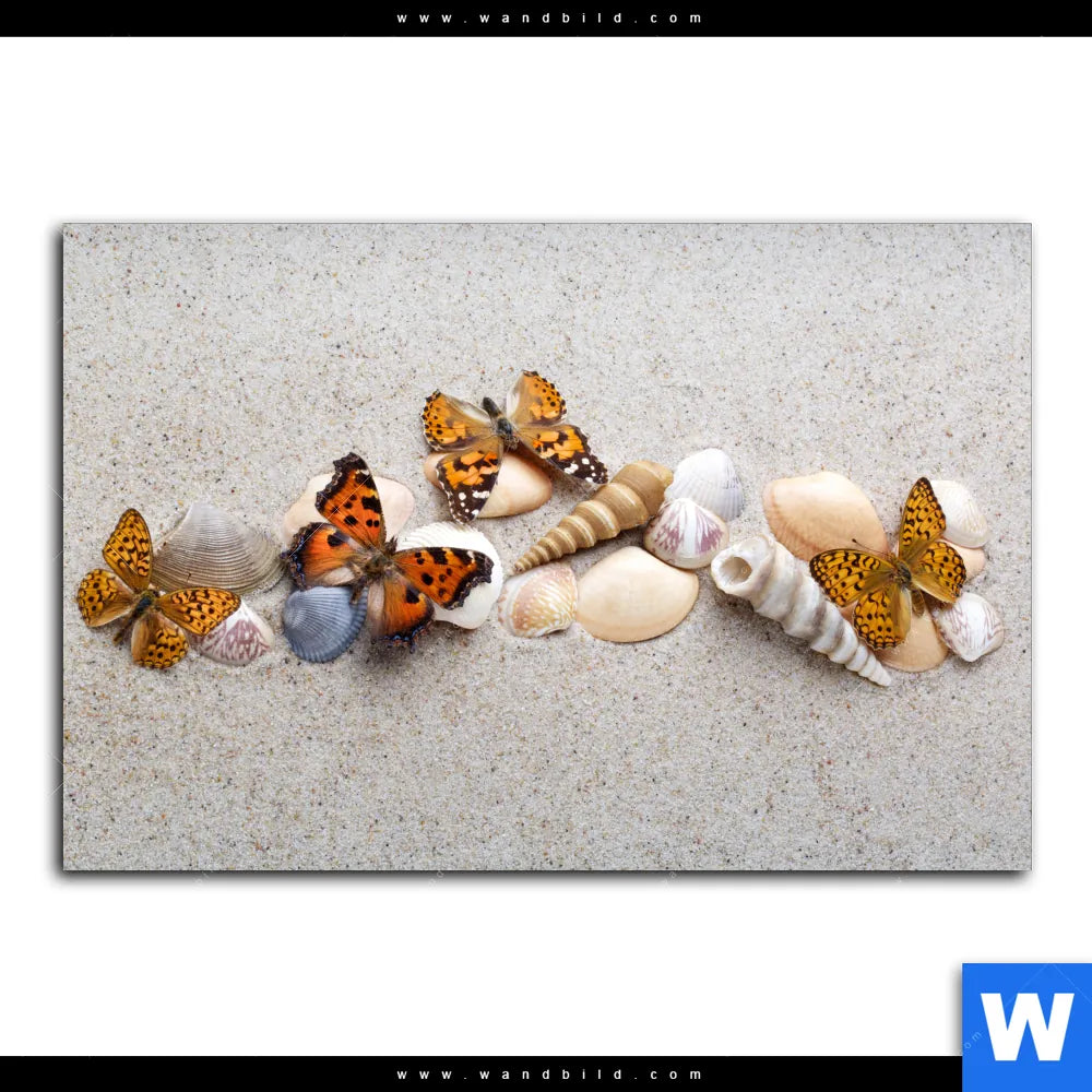 Leinwandbild | Schmetterlinge & Muscheln im Sand | Querformat