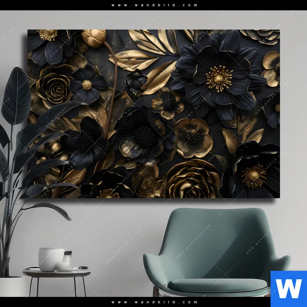 Leinwandbild | Schwarze und goldene Blüten | Querformat