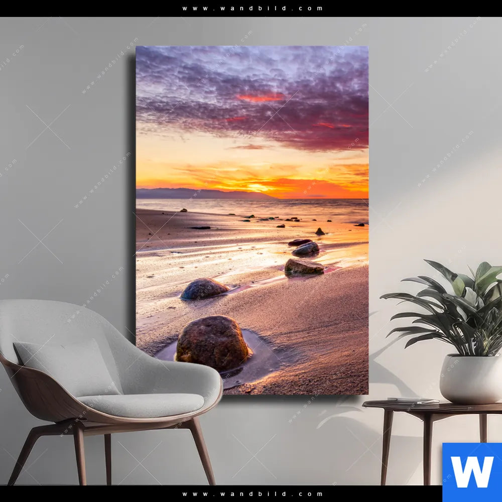 Leinwandbild | Sonnenuntergang am Strand mit Felsen | Hochformat