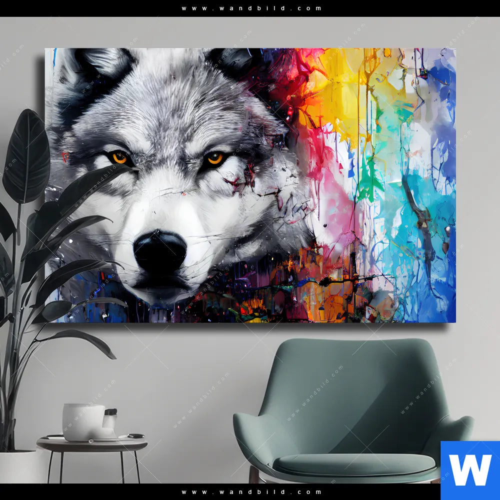 Leinwandbild | Wolf mit bunten Farbspritzern | Querformat