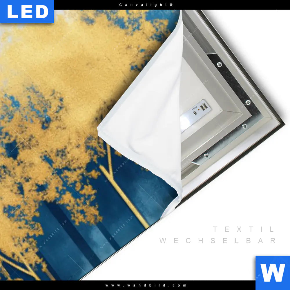 Canvalight® TEX Leuchtbild | Abstrakter Wald - Blau & Gold | Panorama