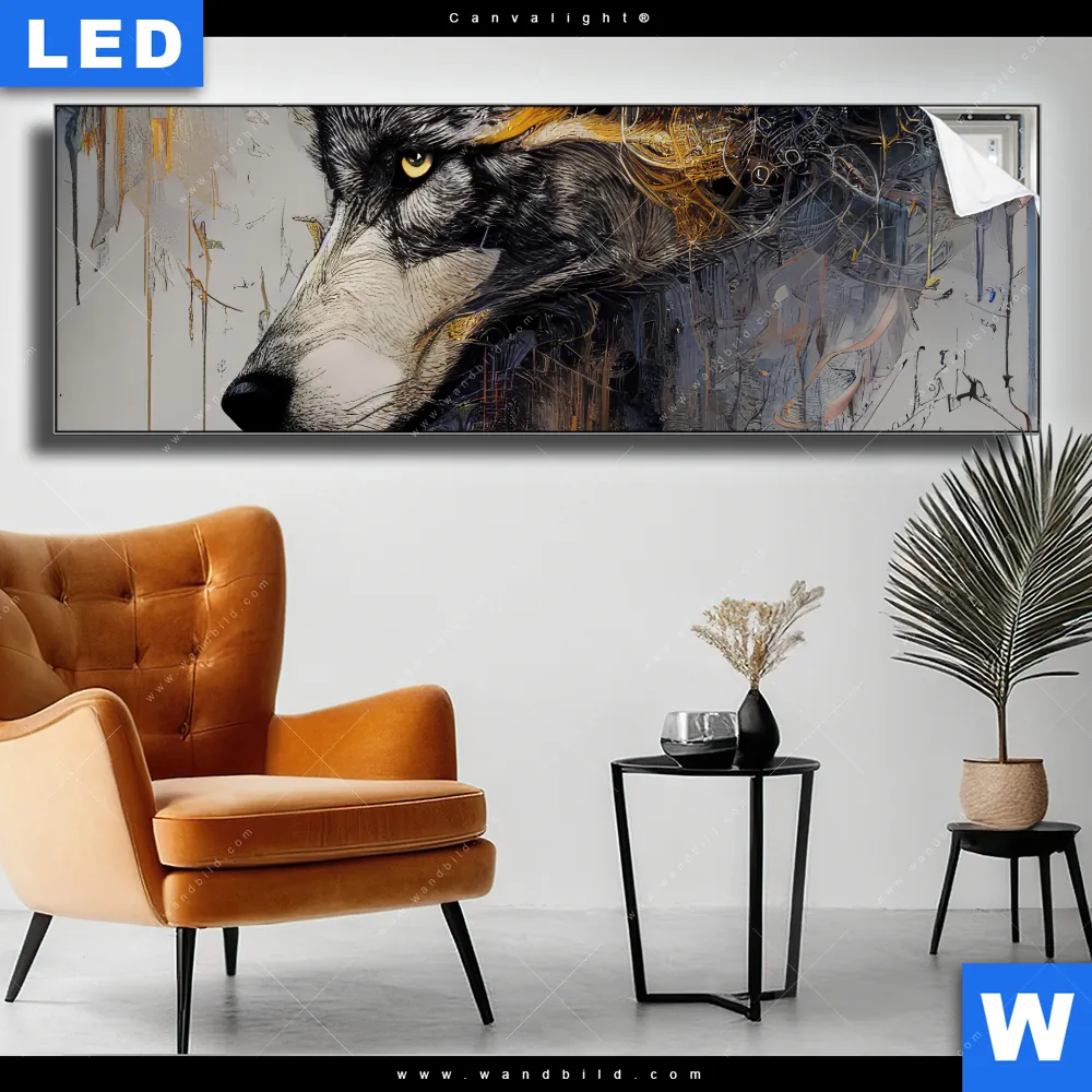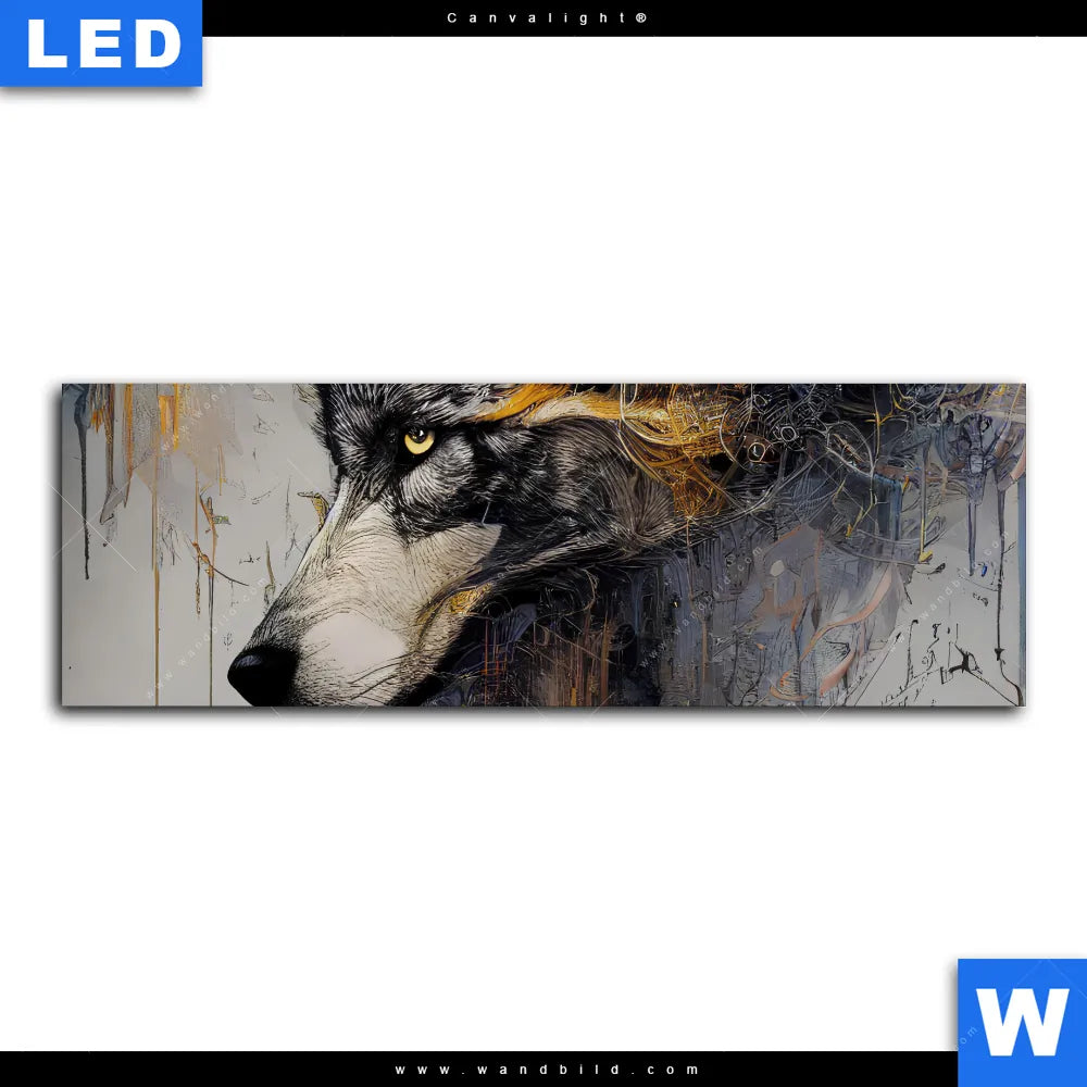 Canvalight® Leuchtbild | Abstrakter Wolf in Gold und Grau | Panorama