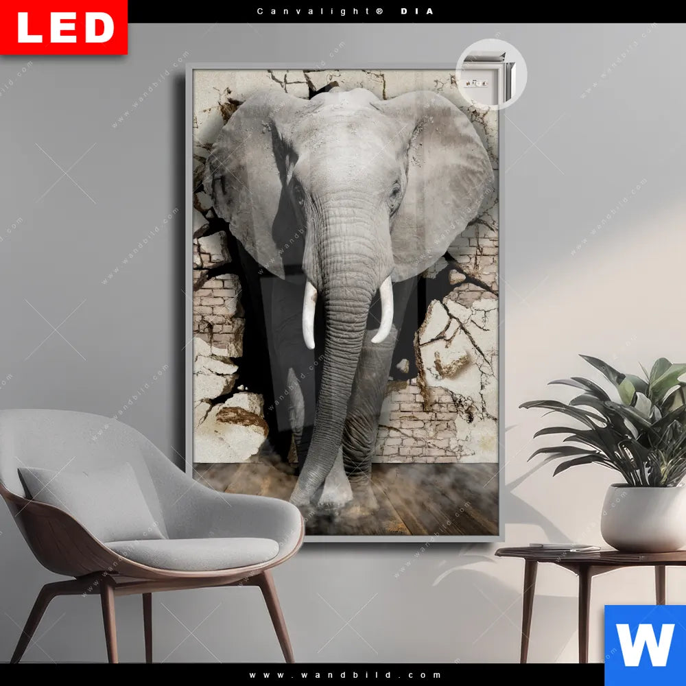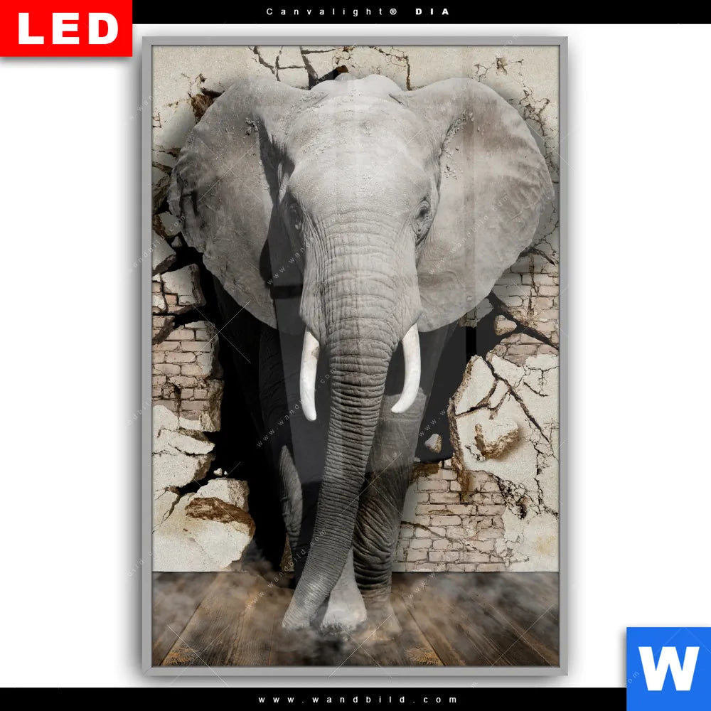 Canvalight® DIA Leuchtbild | Elefant bricht durch Mauer | Hochformat