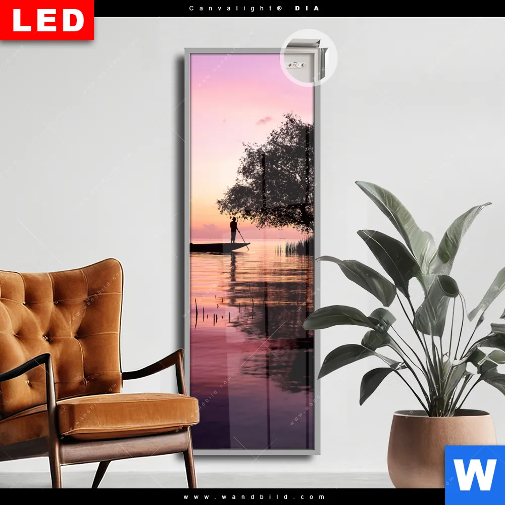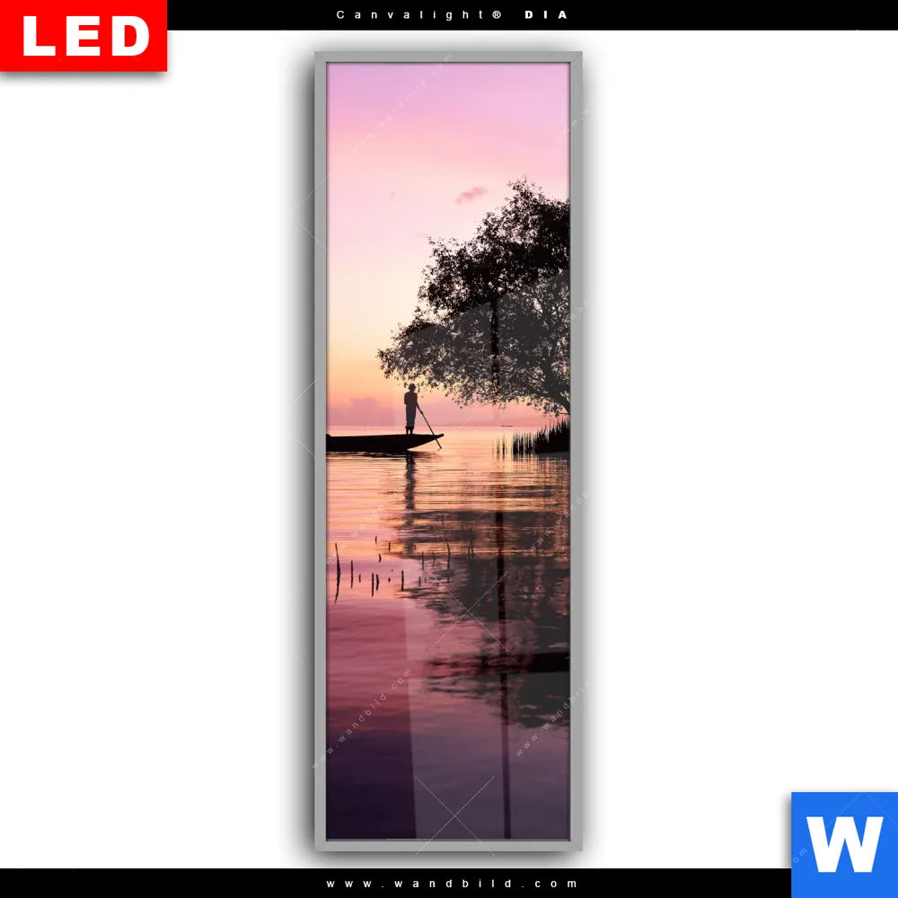 Canvalight® DIA Leuchtbild | Fischer auf Boot Sonnenaufgang | Schmal