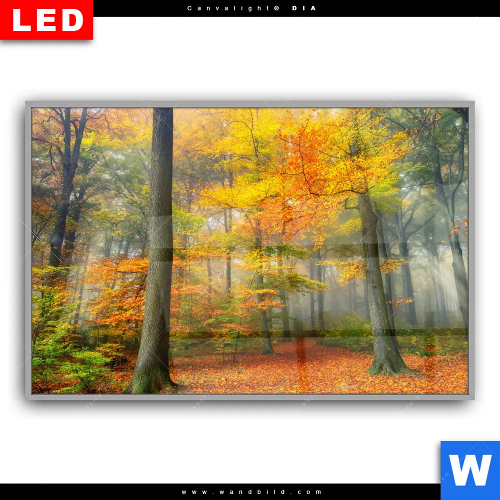Canvalight® DIA Leuchtbild | Herbstfarben im nebligen Wald | Querformat