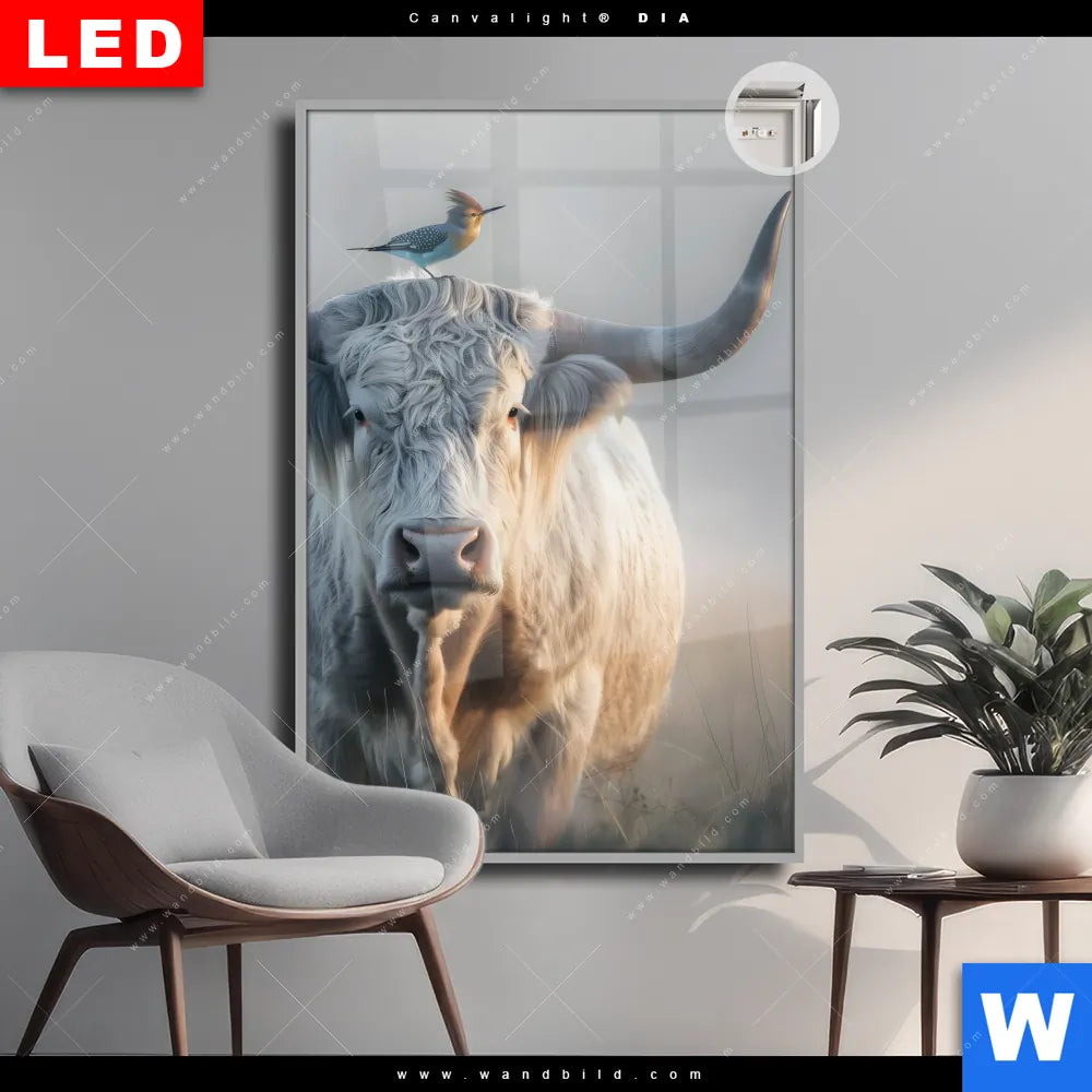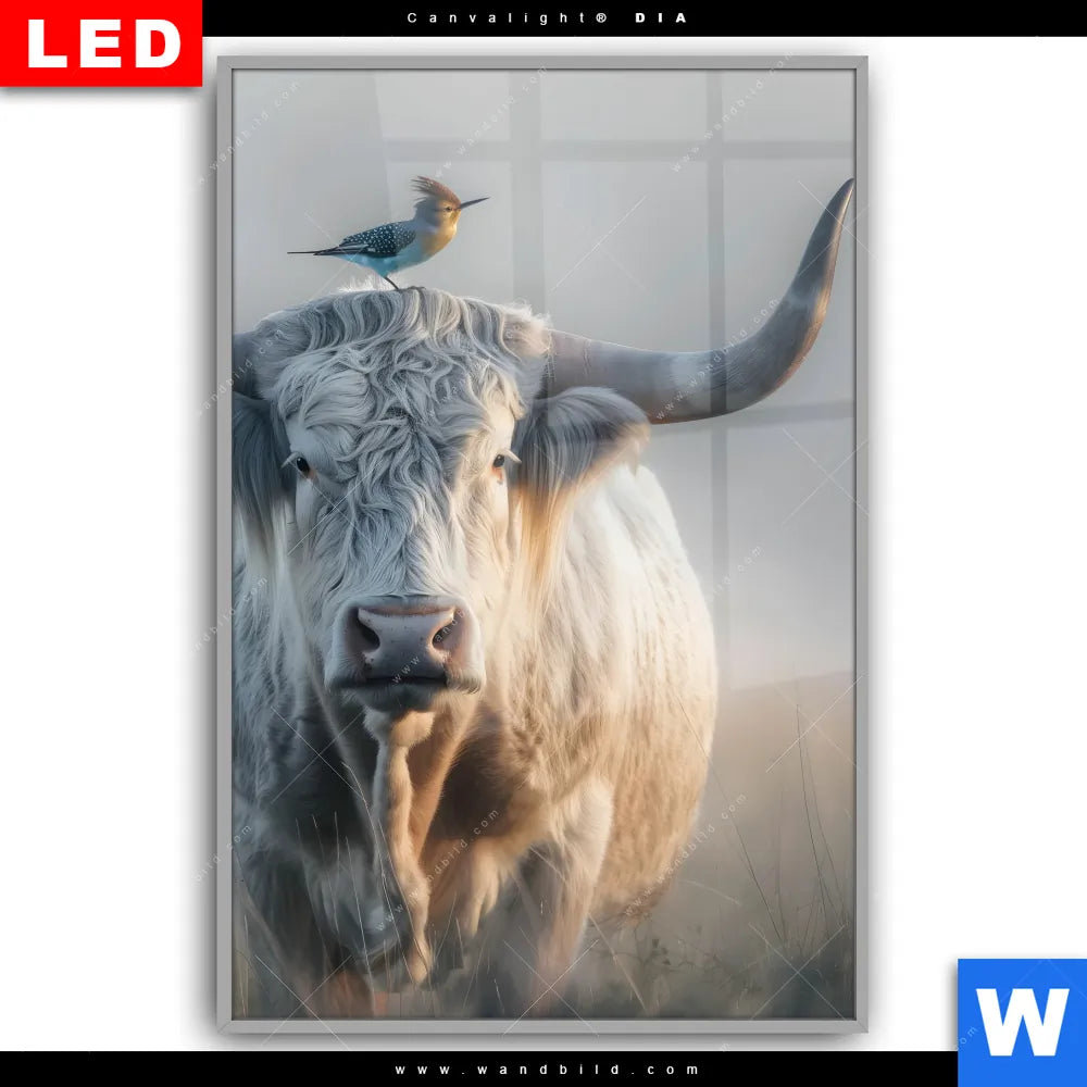 Canvalight® DIA Leuchtbild | Hochlandrind & bunter Vogel | Hochformat