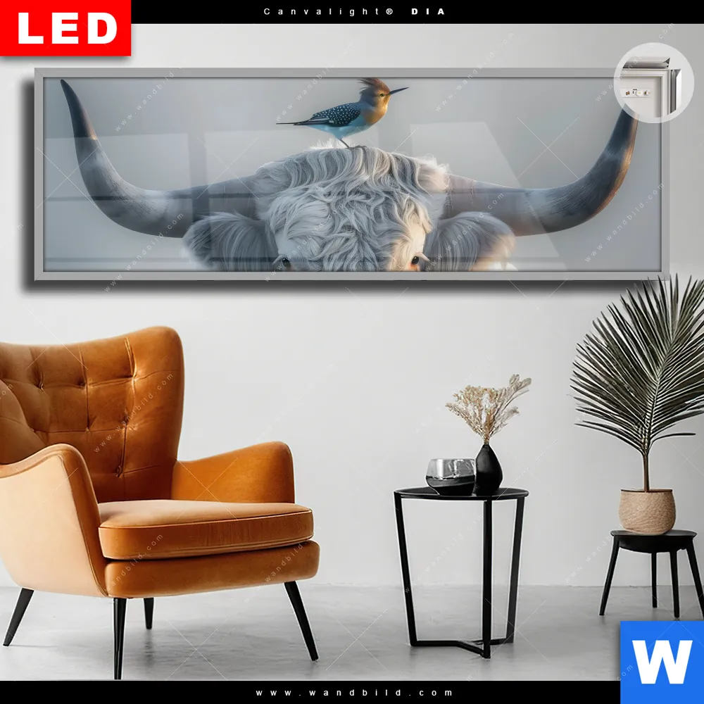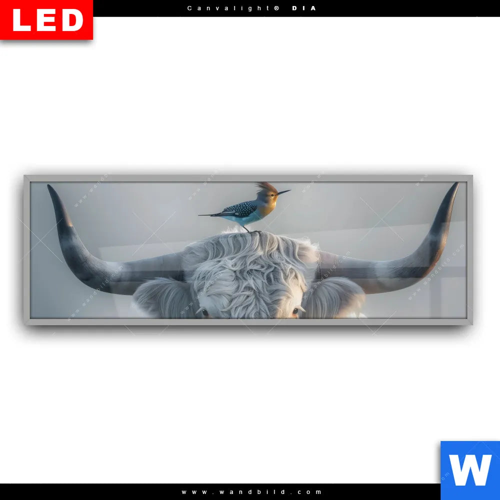 Canvalight® DIA Leuchtbild | Hochlandrind & bunter Vogel | Panorama