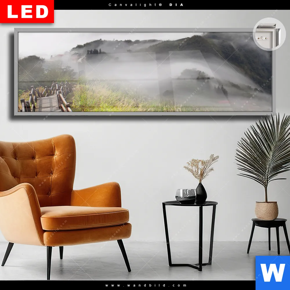 Canvalight® DIA Leuchtbild | Holztreppe auf Berg mit Wolken | Panorama