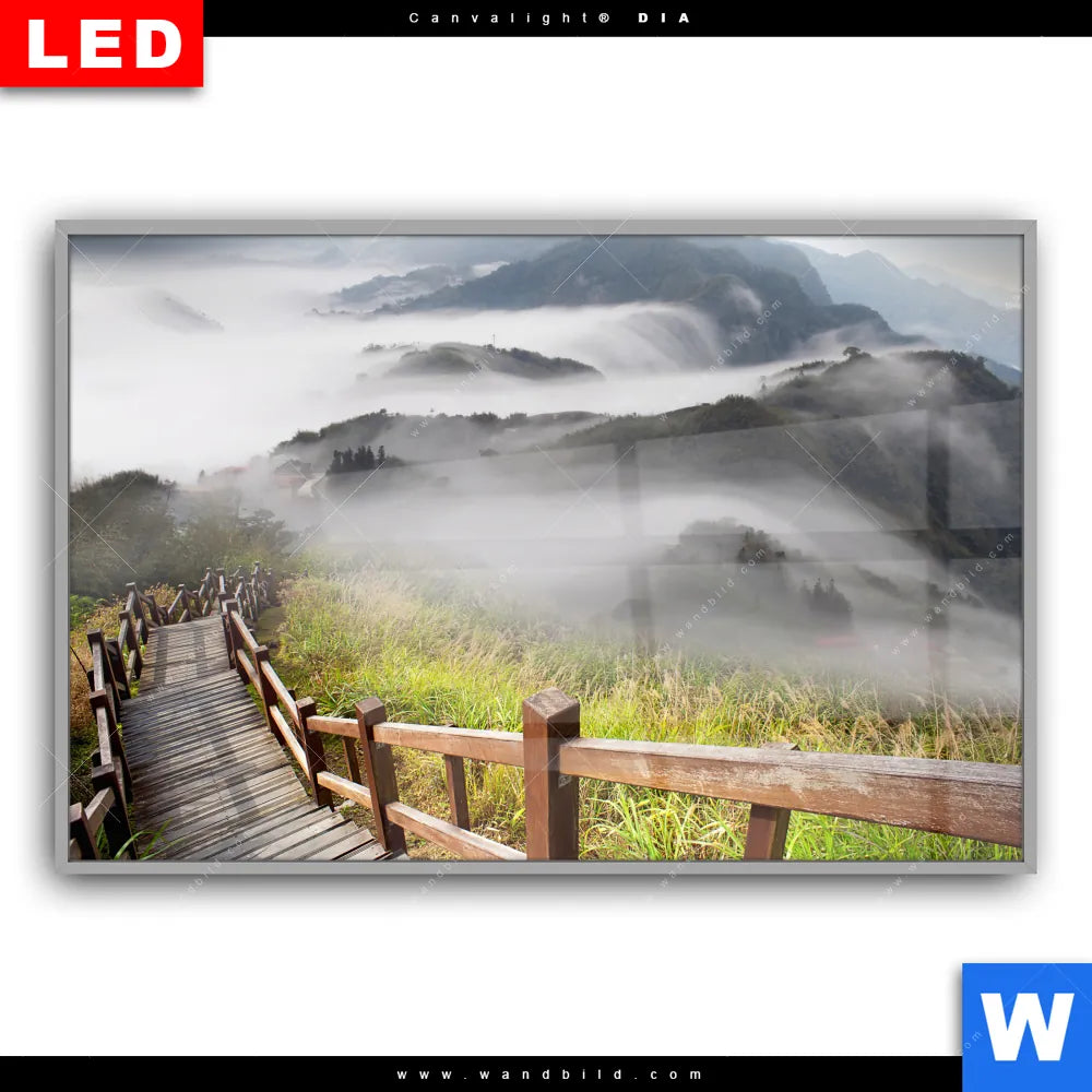 Canvalight® DIA Leuchtbild | Holztreppe auf Berg mit Wolken | Querformat