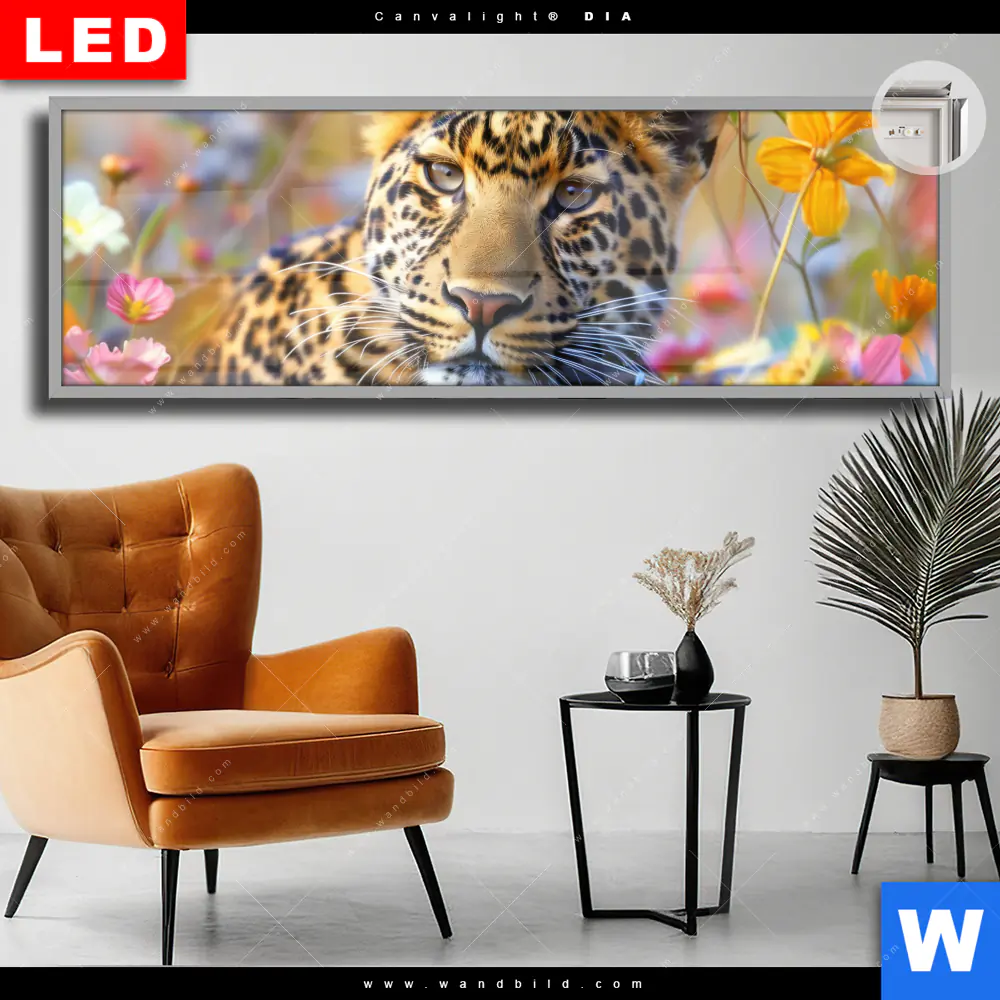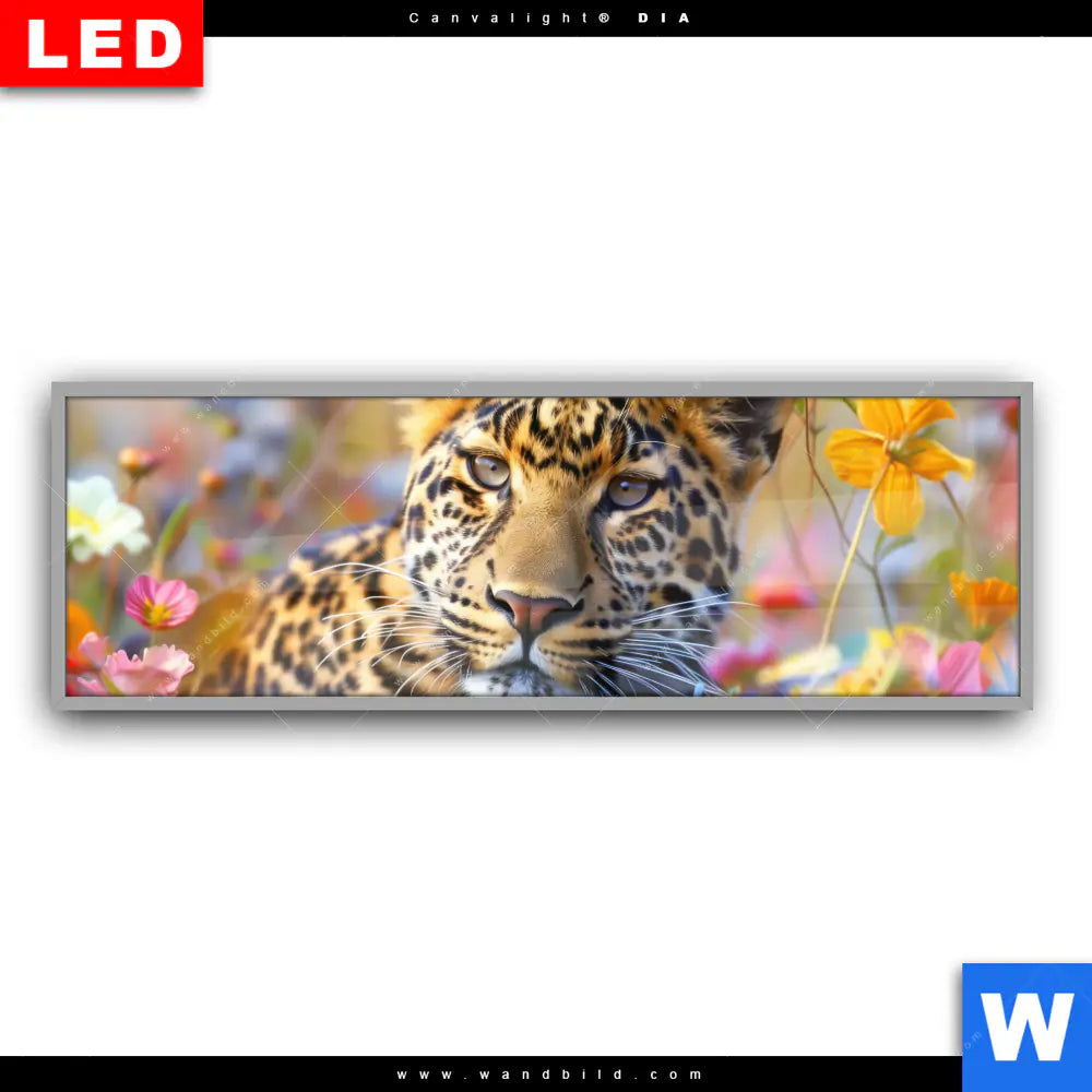 Canvalight® DIA Leuchtbild | Leopard in blühender Wildnis | Panorama