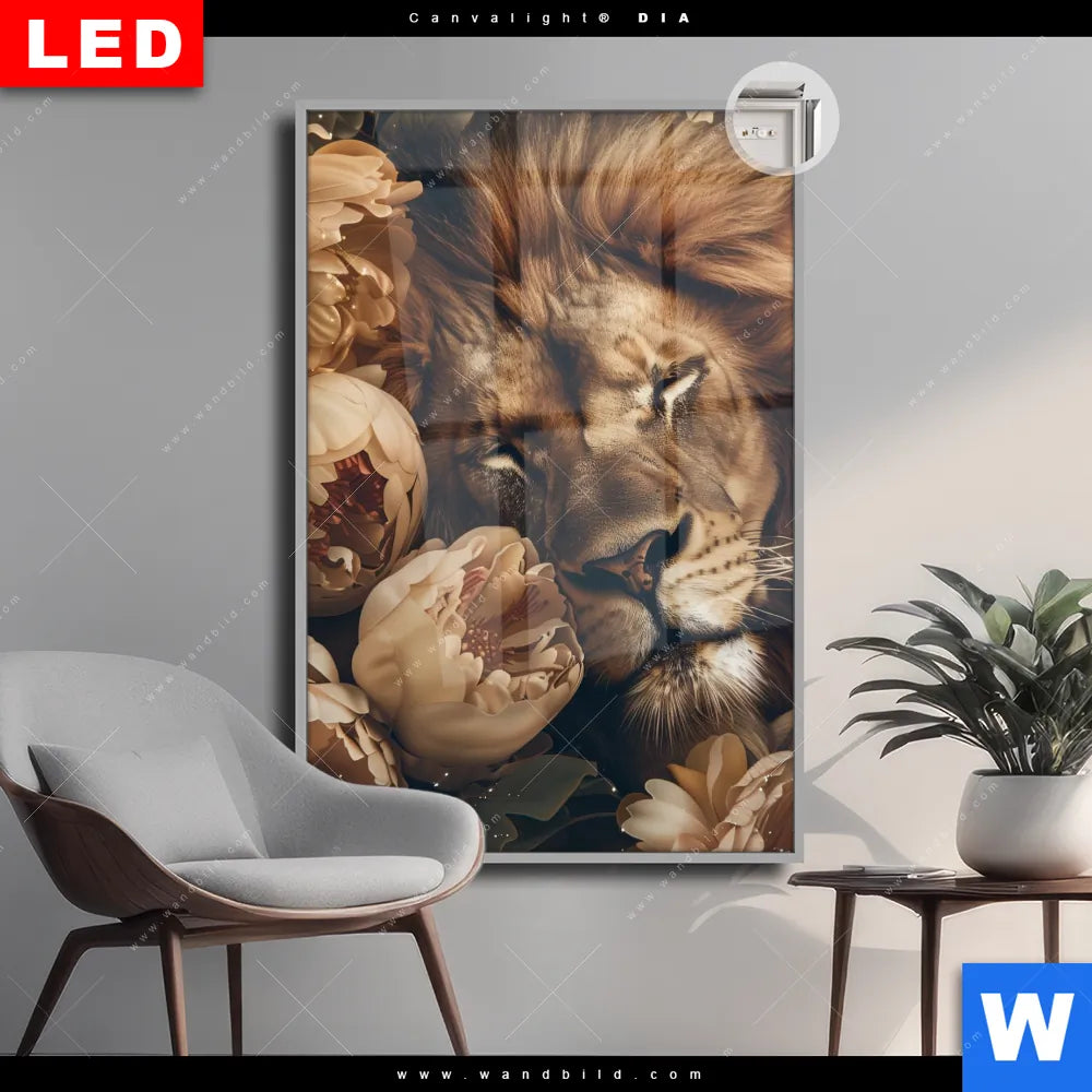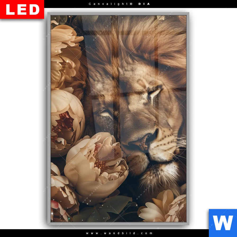 Canvalight® DIA Leuchtbild | Löwe schläft in Blüten | Hochformat