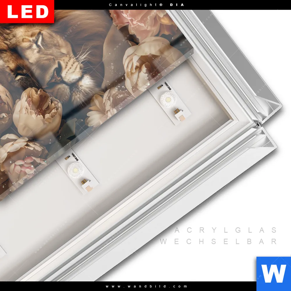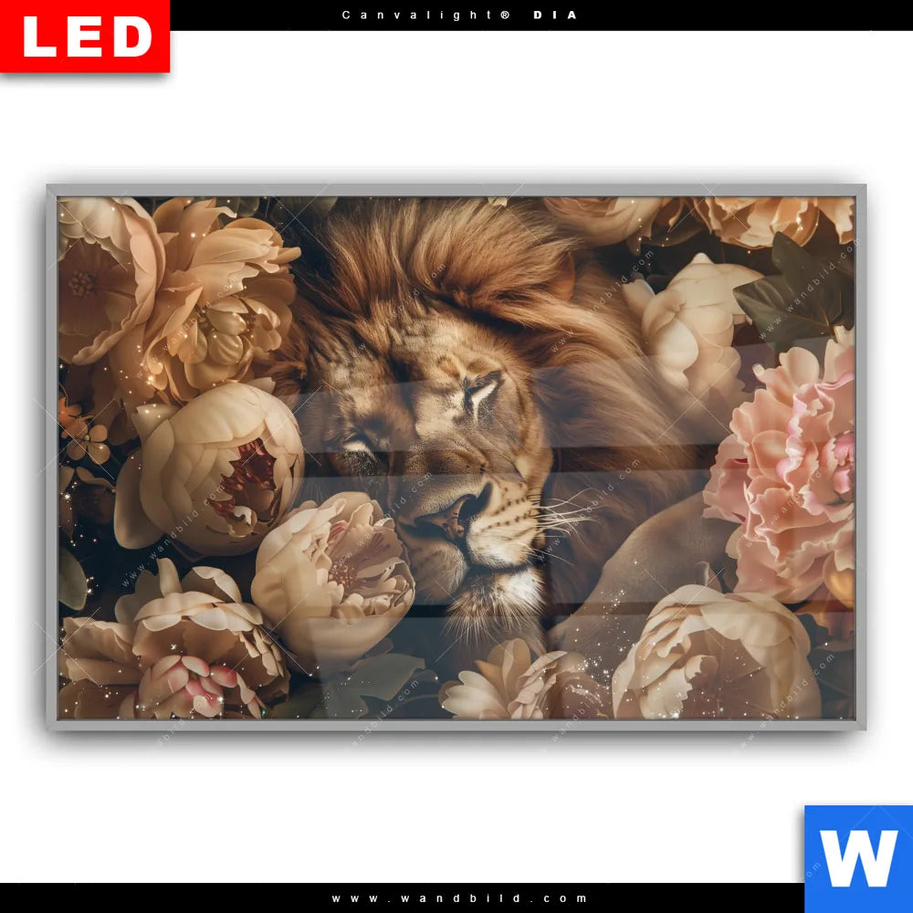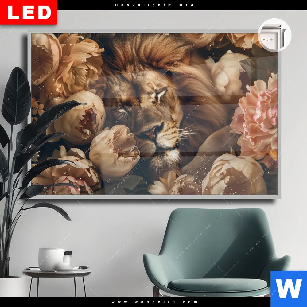 Canvalight® DIA Leuchtbild | Löwe schläft in Blüten | Querformat
