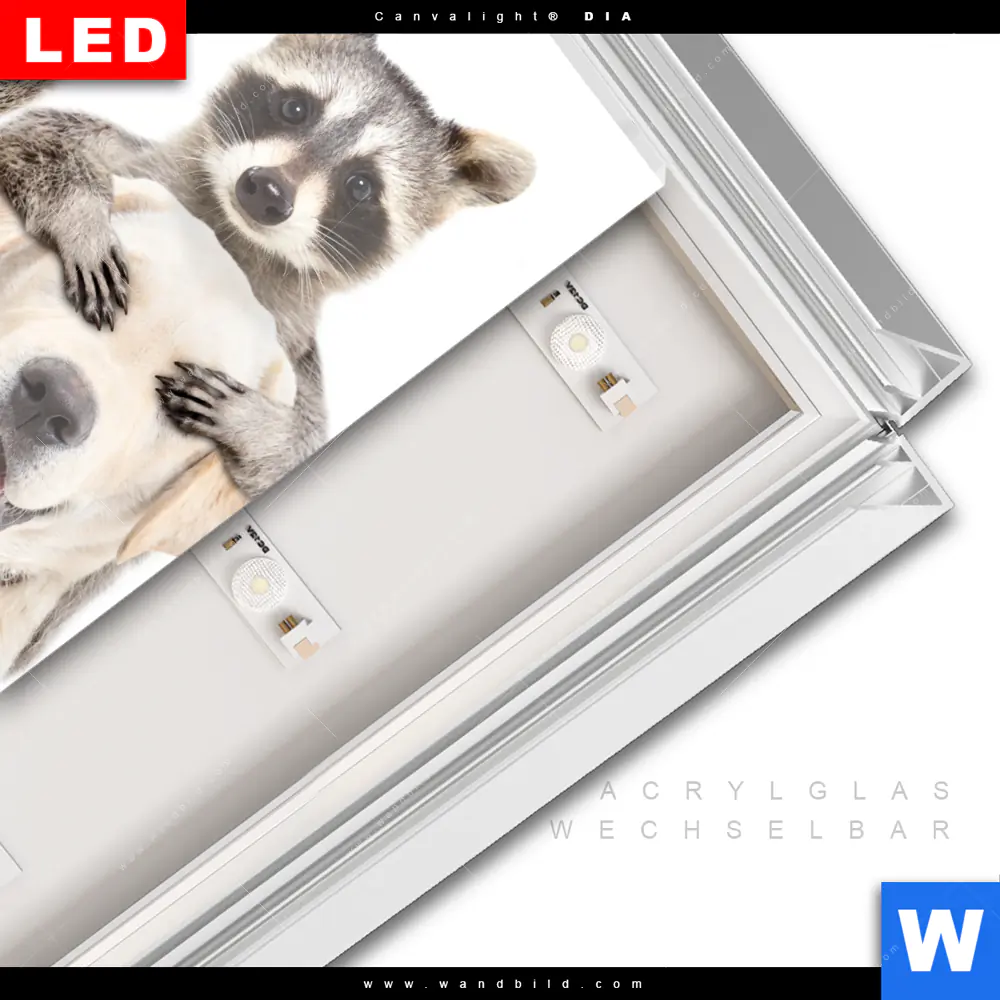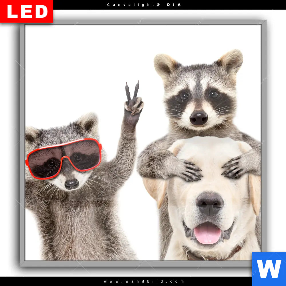 Canvalight® DIA Leuchtbild | Lustige Waschbären mit Hund | Quadrat
