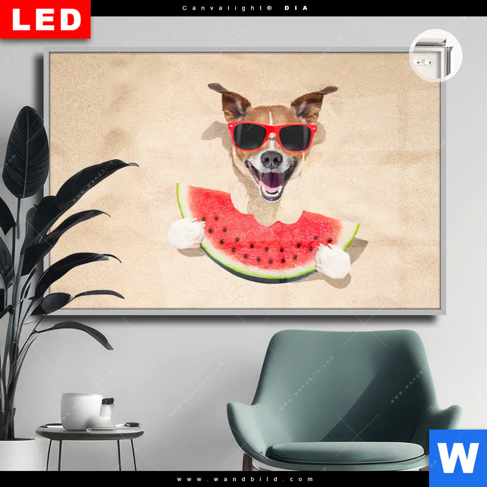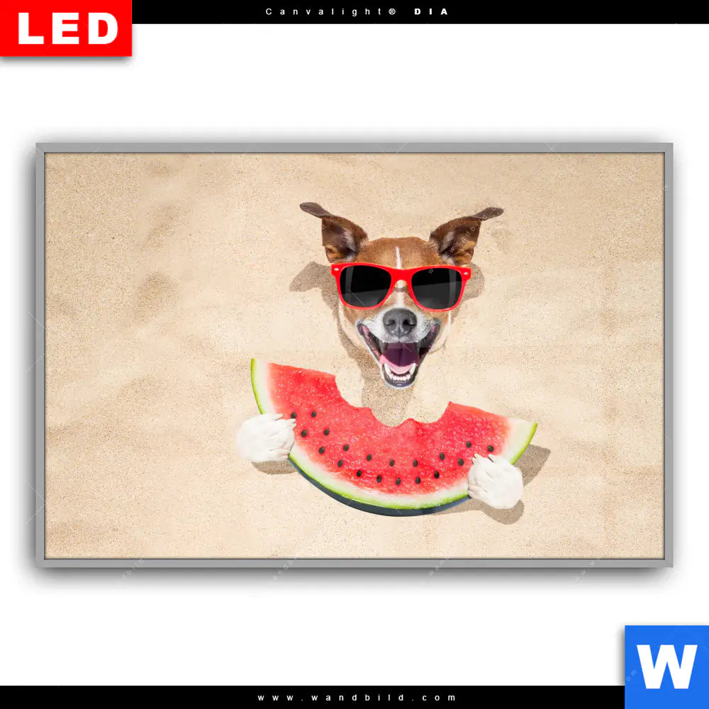 Canvalight® DIA Leuchtbild | Lustiger Hund am Strand | Querformat