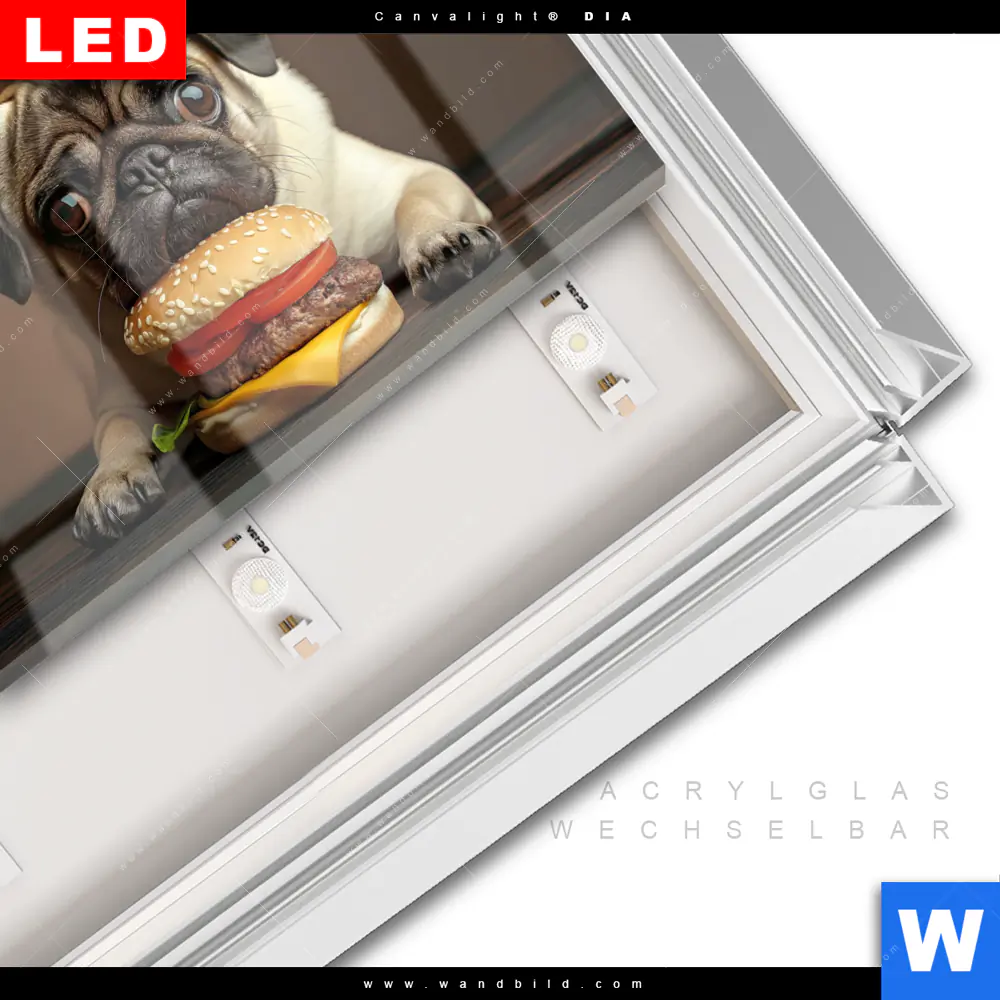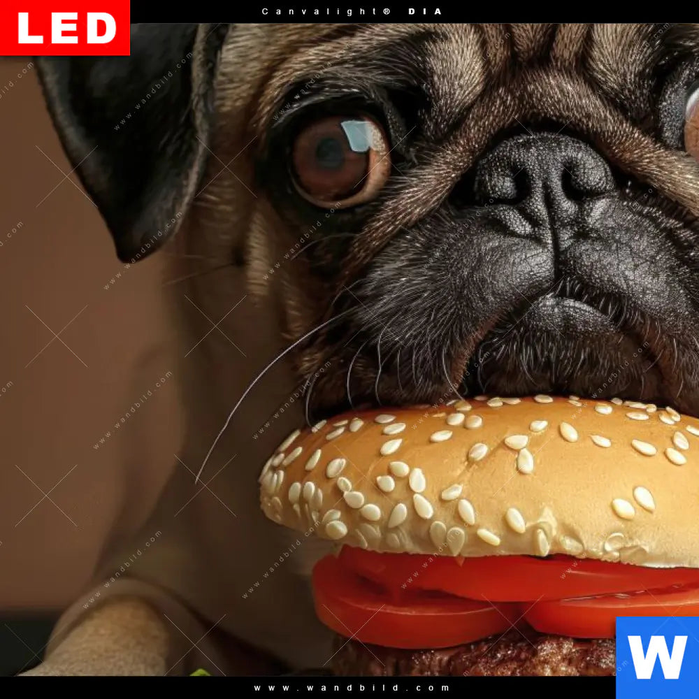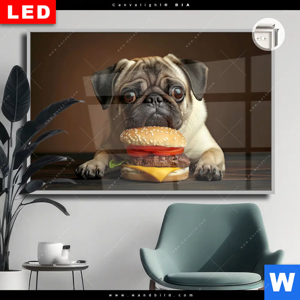 Canvalight® DIA Leuchtbild | Mops mit Cheeseburger | Querformat