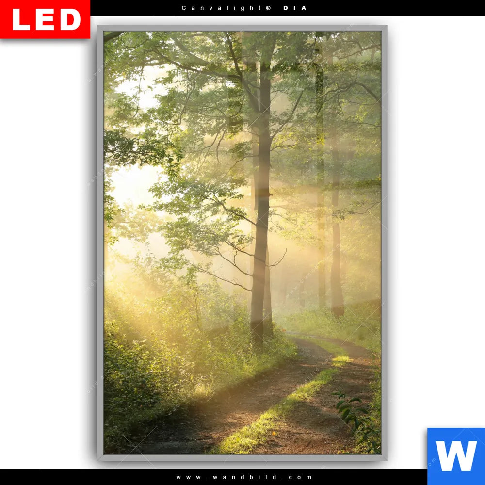 Canvalight® DIA Leuchtbild | Morgenspaziergang im nebeligem Wald | Hochformat