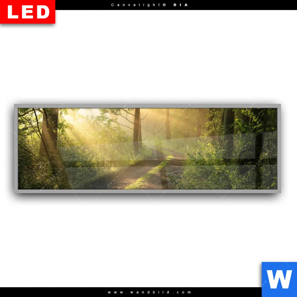 Canvalight® DIA Leuchtbild | Morgenspaziergang im nebeligem Wald | Panorama