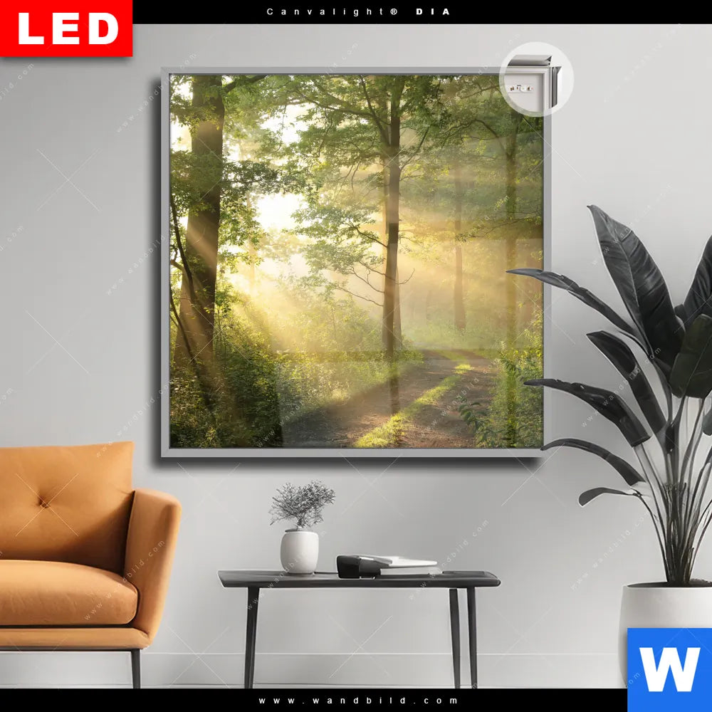 Canvalight® DIA Leuchtbild | Morgenspaziergang im nebeligem Wald | Quadrat