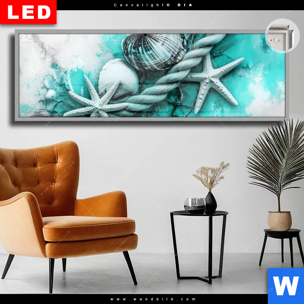 Canvalight® DIA Leuchtbild | Muscheln-Meereszauber in Türkis | Panorama